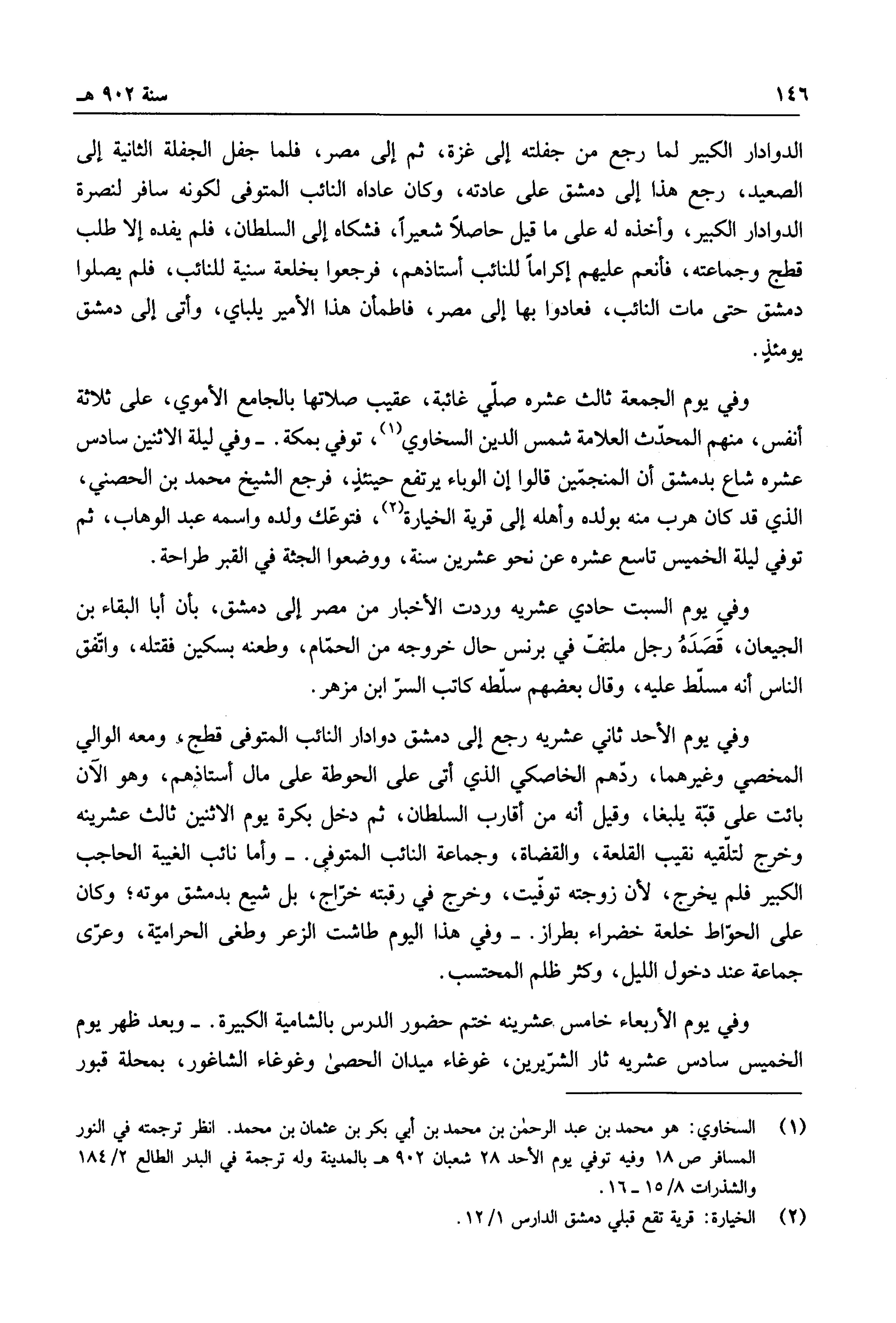 وفي يوم الجمعة ثالث عشره صلي غائبة، عقيب صلاتها بالجامع الأموي، على ثلاثة أنفس منهم المحدث العلامة شمس الدين السخاوي، توفي بمكة، وفي ليلة الاثنين سادس عشره شاع بدمشق أن المنجمين قالوا إن الوباء يرتفع حينئذٍ، فرجع الشيخ محمد بن الحصني، الذي قد كان هرب منه بولده وأهله إلى قرية الخيارة، فتوعك ولده واسمه عبد الوهاب، ثم توفي ليلة الخميس تاسع عشره عن نحو عشرين سنة، ووضعوا الجثة في القبر طراحة.