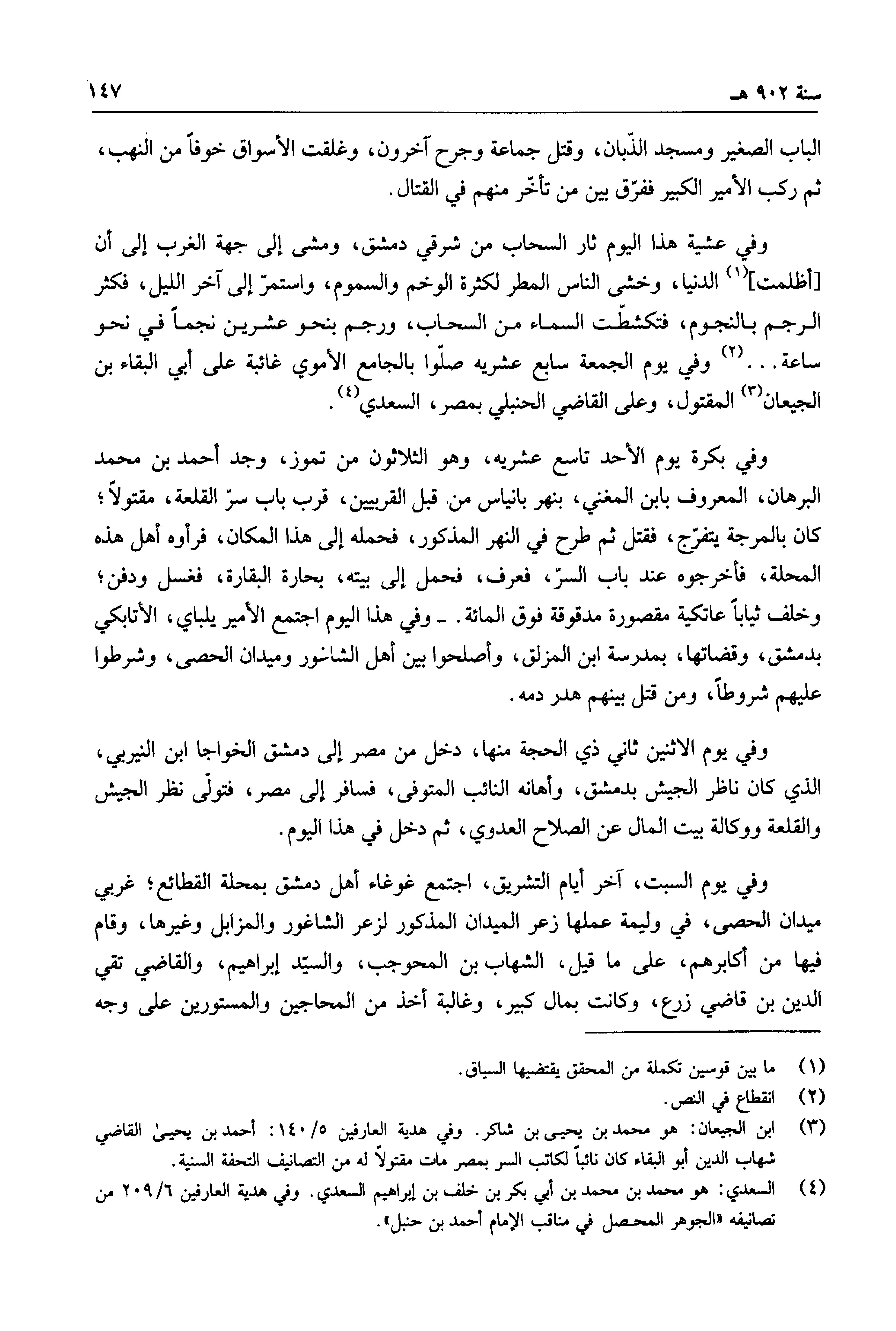 وفي عشية هذا اليوم ثار السحاب من شرقي دمشق، ومشى إلى جهة الغرب إلى أن أظلمت الدنيا، وخشى الناس المطر لكثرة الوخم والسموم، واستمر إلى آخر الليل، فكثر الرجم بالنجوم، فتكشطت السماء من السحاب، ورجم بنحو عشرين نجماً في نحو ساعة.... وفي يوم الجمعة سابع عشريه صلوا بالجامع الأموي غائبة على أبي البقاء بن الجيعان المقتول وعلى القاضي الحنبلي بمصر، السعدي.