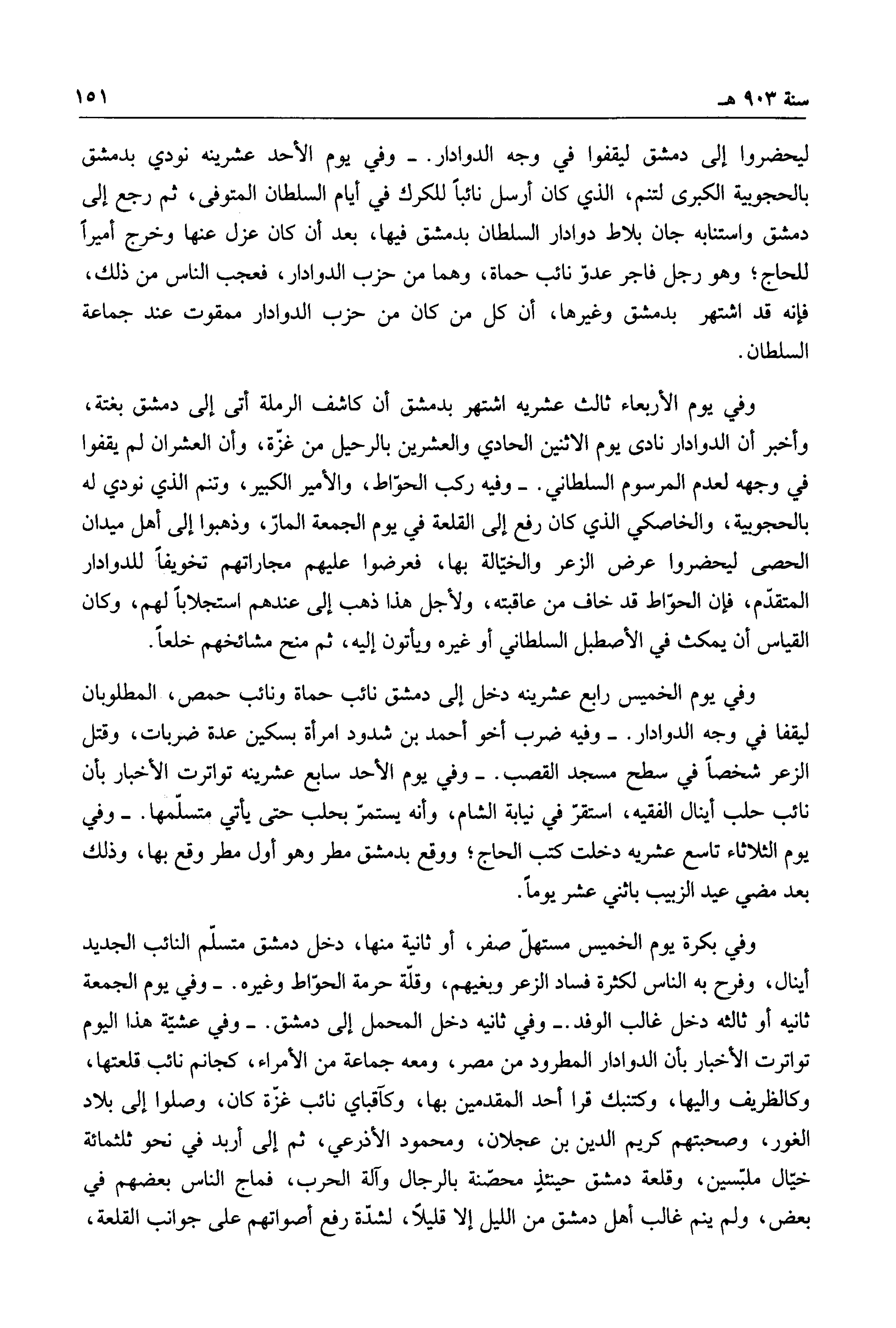 وفي عشية هذا اليوم تواترت الأخبار بأن الدوادار المطرود من مصر، ومعه جماعة من الأمراء، كجانم نائب قلعتها، وكالظريف واليها، وكتنبك قرا أحد المقدمين بها، وكآقباي نائب غزة كان، وصلوا إلى بلاد الغور، وصحبتهم كريم الدين بن عجلان، ومحمود الأذرعي، ثم إلى أربد في نحو ثلثمائة، خيال ملبسين، وقلعة دمشق حينئذٍ محصنة بالرجال وآلة الحرب، فماج الناس بعضهم في بعض، ولم ينمم غالب أهل دمشق من الليل إلا قليلاً، لشدة رفع أصواتهم على جوانب القلعة،