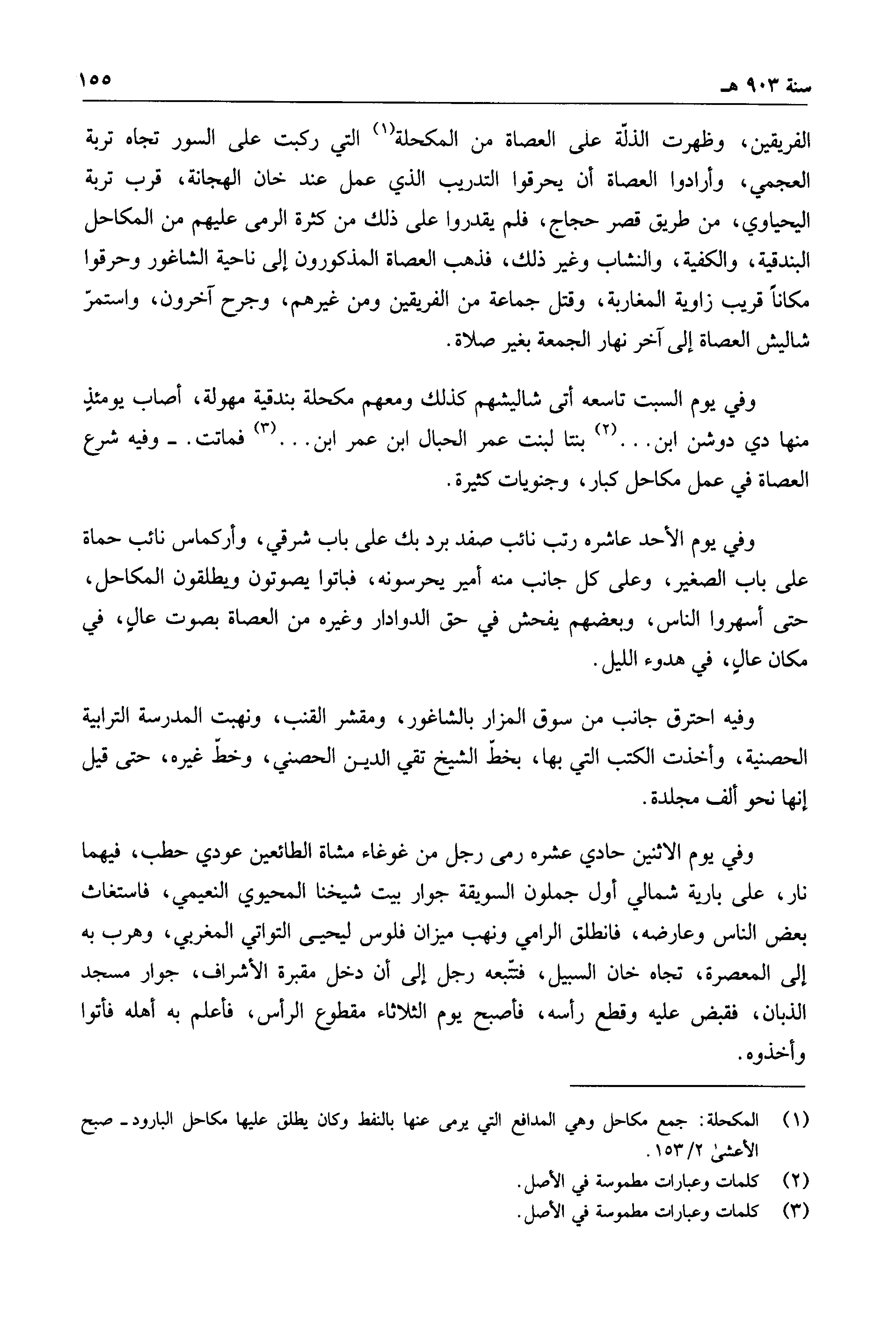 الفريقين، وظهرت الذلة على العصاة من المكحلة التي ركبت على السور تجاه تربة العجمي، وأرادوا العصاة أن يحرقوا التدريب الذي عمل عن خان الهجانة، قرب تربة اليحياوي، من طريق قصر حجاج، فلم يقدروا على ذلك من كثرة الرمى عليهم من المكاحل البندقية، والكفية، والنشاب وغير ذلك، فذهب العصاة المذكورون إلى ناحية الشاغور وحرقوا مكاناً قريب زاوية المغاربة، وقتل جماعة من الفريقين ومن غيرهم، وجرح آخرون، واستمر شاليش العصاة إلى آخر نهار الجمعة بغير صلاة.