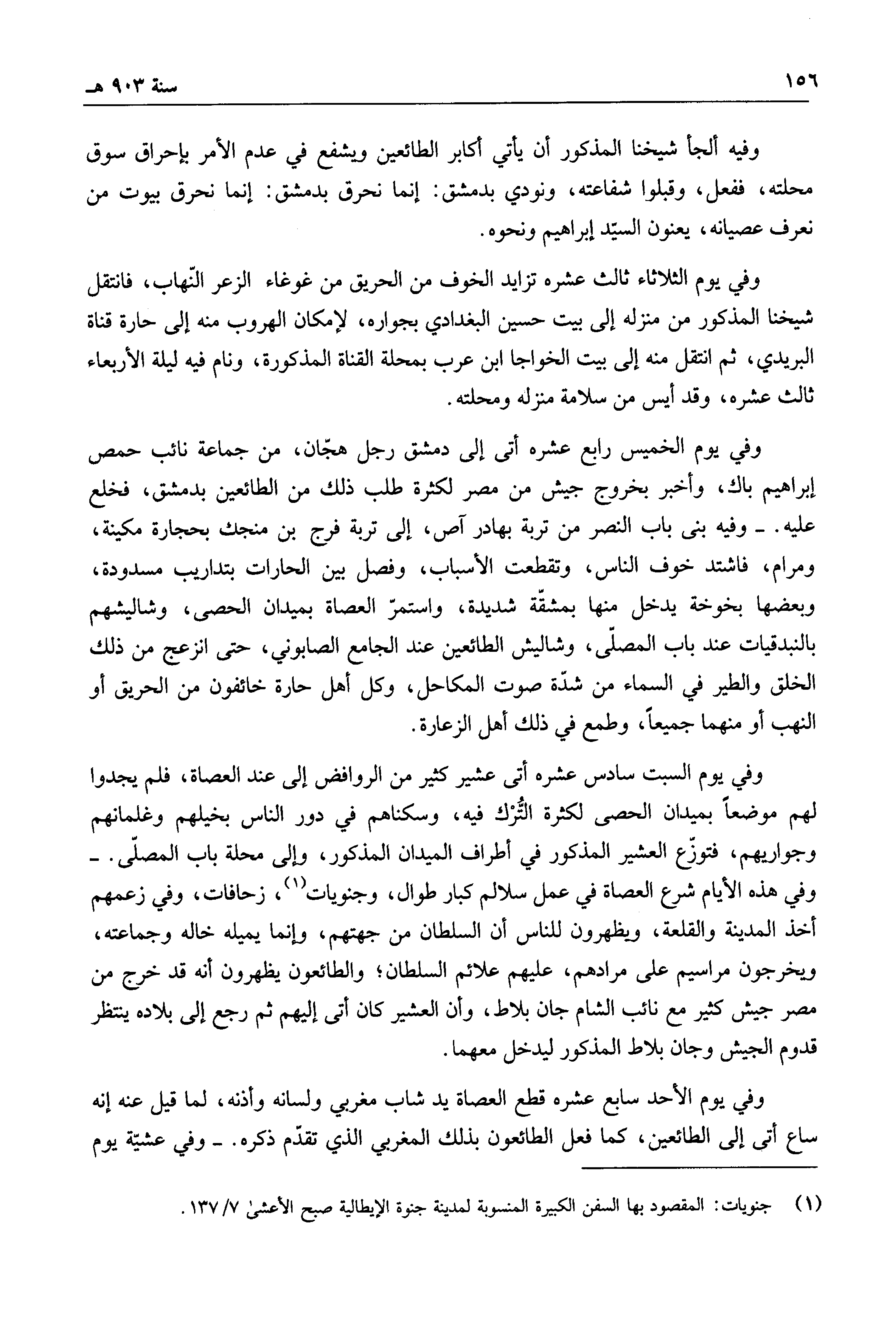 وفي يوم السبت سادس عشره أتى عشير كثير من الروافض إلى عند العصاة، فلم يجدوا لهم موضعاً بميدان الحصى لكثرة الترك فيه، وسكناهم في دور الناس بخيلهم وغلمانهم وجواريهم، فتوزع العشير المذكور في أطراف الميدان المذكرور، وإلى محلة باب المصلى.