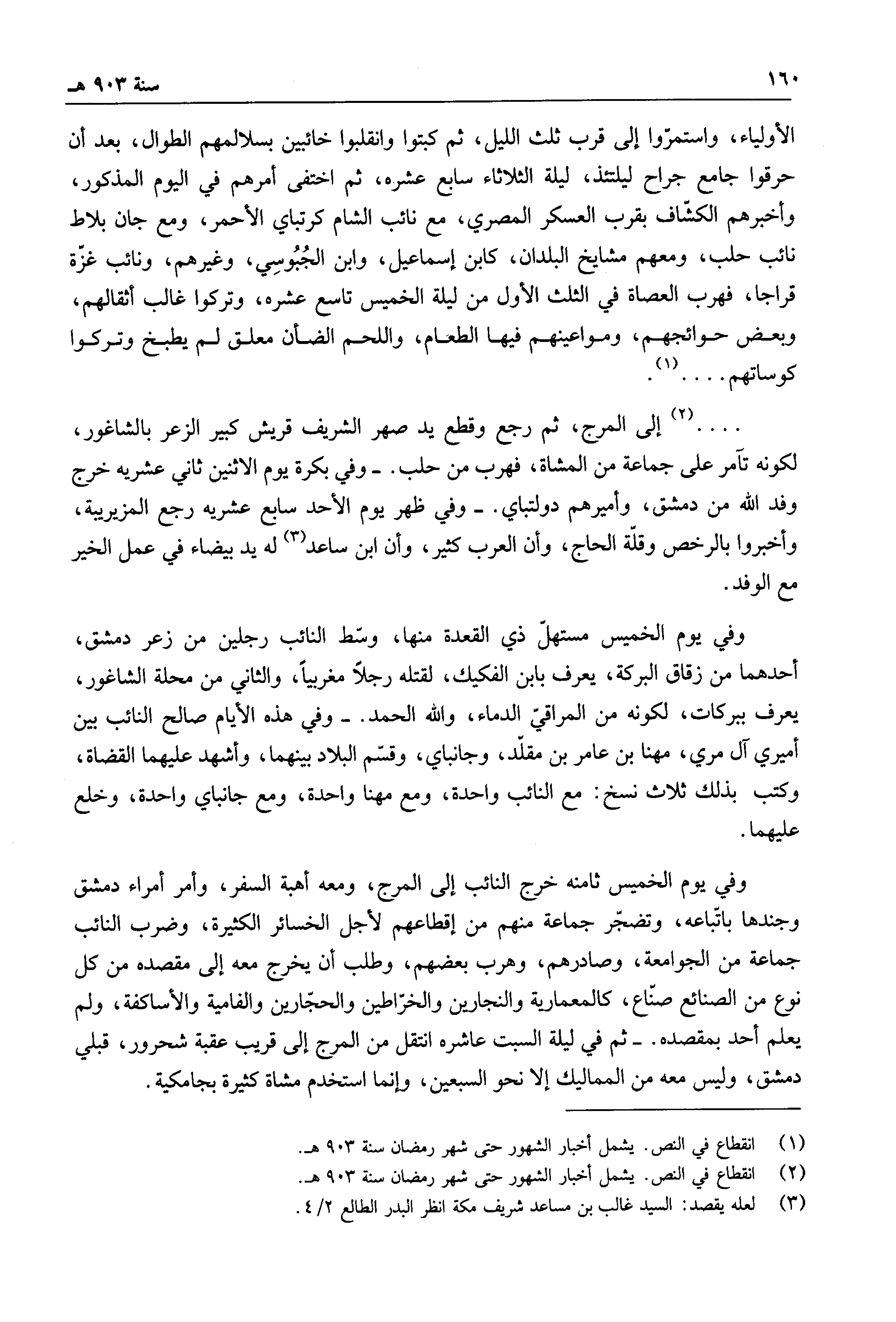 .... إلى المرج، ثم رجع وقطع يد صهر الشريف قريش كبير الزعر بالشاغور، لكونه تآمر على جماعة من المشاة، فهرب من حلب.