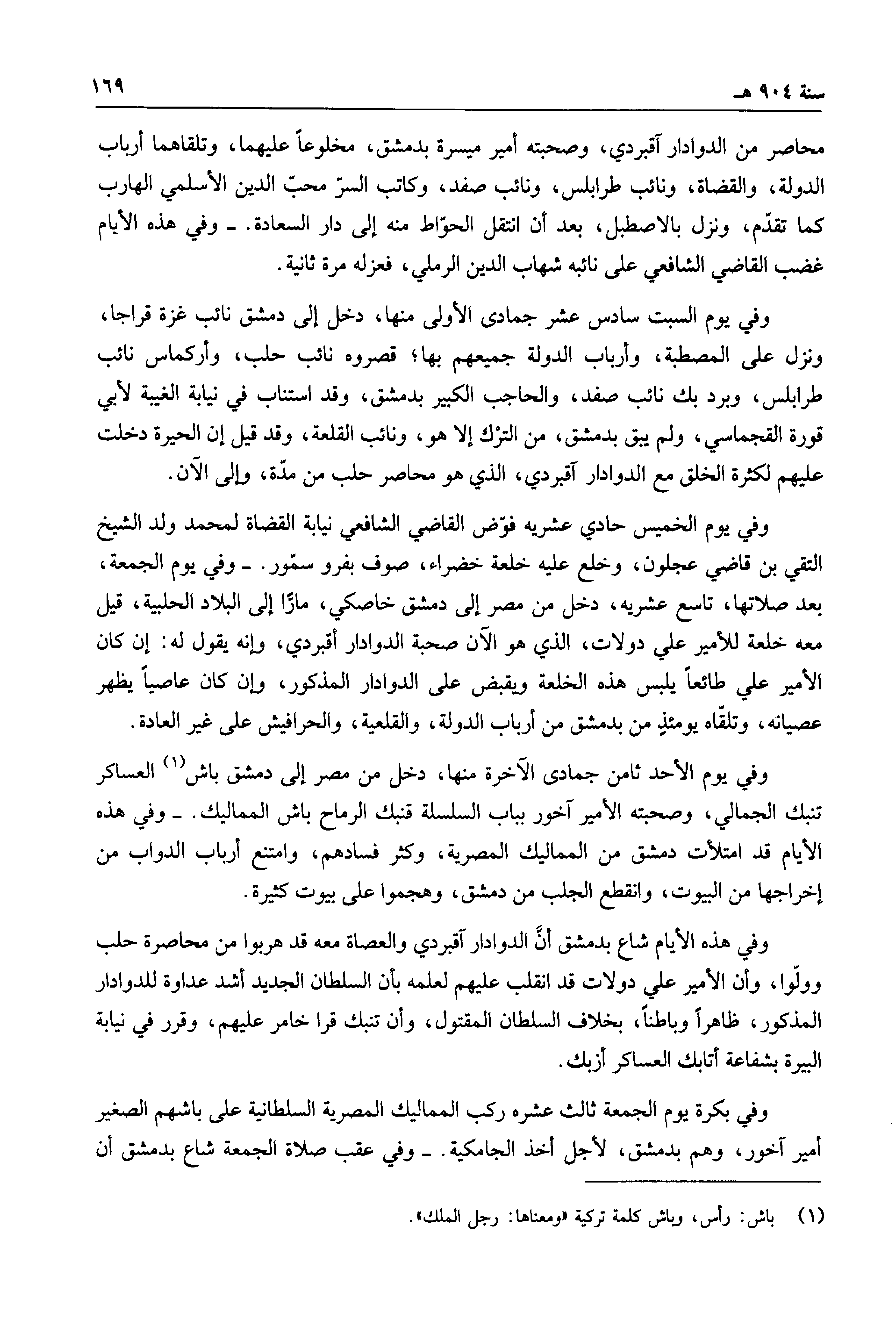 وفي يوم الحمعة، بعد صلاتها، تاسع عشريه، دخل من مصر إلى دمشق خاصكي، ماراً إلى البلاد الحلبية، قيل معه خلعة للأمير علي دولات، الذي هو الآن صحبة الدوادار أقبردي، وإنه يقول له: إن كان الأمير علي طائعاً يلبس هذه الخلعة ويقبض على الدوادار المذكور، وإن كان عاصياً يظهر عصيانه، وتلقاه يومئذٍ بدمشق من أرباب الدولة، والقلعية، والحرافيش على غير العادة.