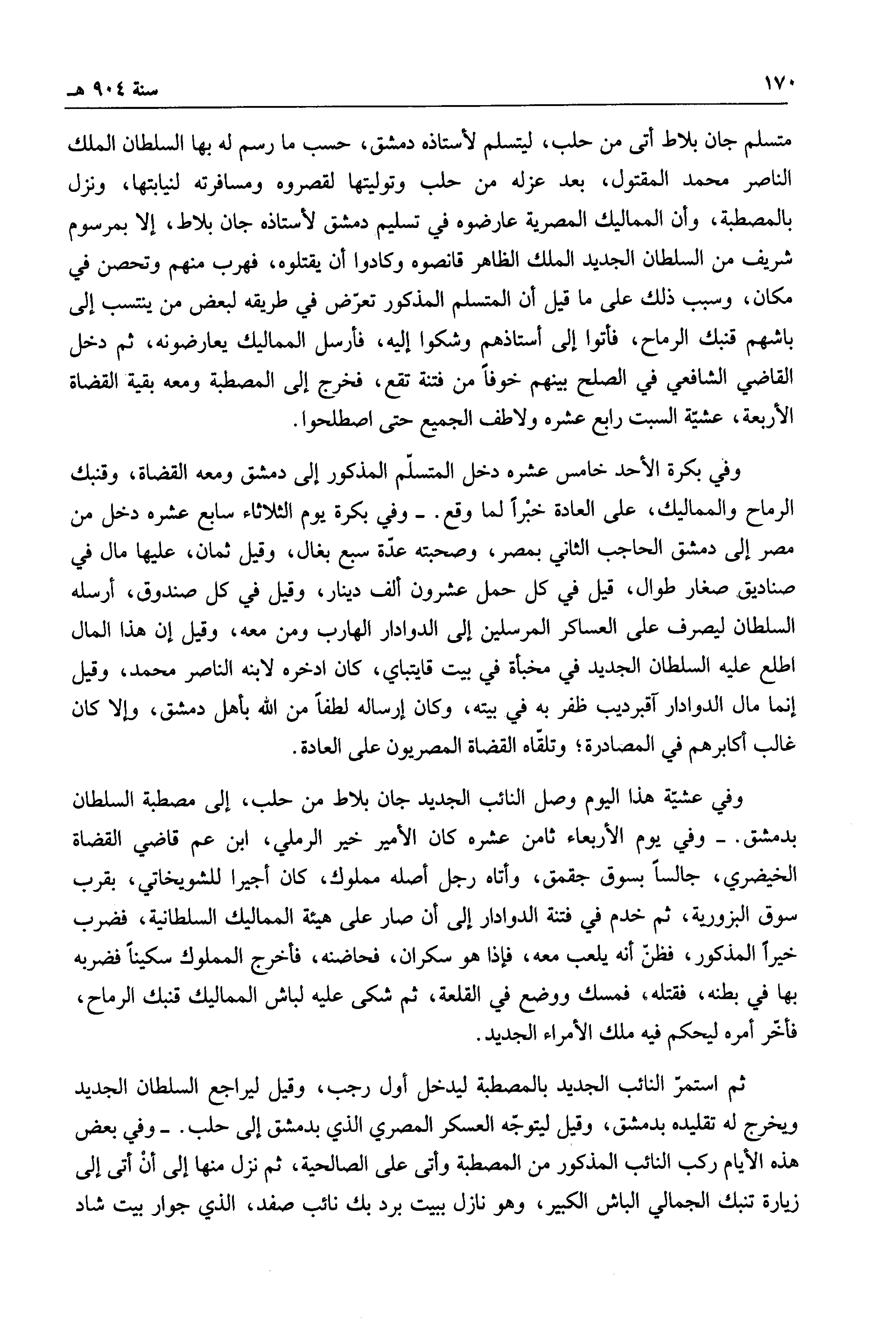 متسلم جان بلاط أتى من حلب، ليتسلم لأستاذه دمشق، حسب ما رسم له بها السلطان الملك الناصر محمد المقتول، بعد عزله من حلب وتوليتها لقصروه ومسافرته لنيابتها، ونزل بالمصطبة، وأن المماليك المصرية عارضوه في تسليم دمشق لأستاذه جان بلاط، إلا بمرسوم شريف من السلطان الجديد لملك الظاهر قانصوه وكادوا أن يقتلوه، فهرب منهم وتحصن في مكان، وسبب ذلك على كما قيل أن المتسلم المذكور تعرض في طريقه لبعض من ينتسب إلى باشهم قنبك الرماح، فأتوا إلى أستاذهم وشكوا إليه، فأرسل المماليك يعارضونه، ثم دخل القاضي الشافعي في الصلح بينهم خوفاً من فتنة تقع، فخرج إلى المصطبة ومعه بقية القضاة الأربعة، عشية السبت رابع عشره ولاطف الجميع حتى اصطلحوا.