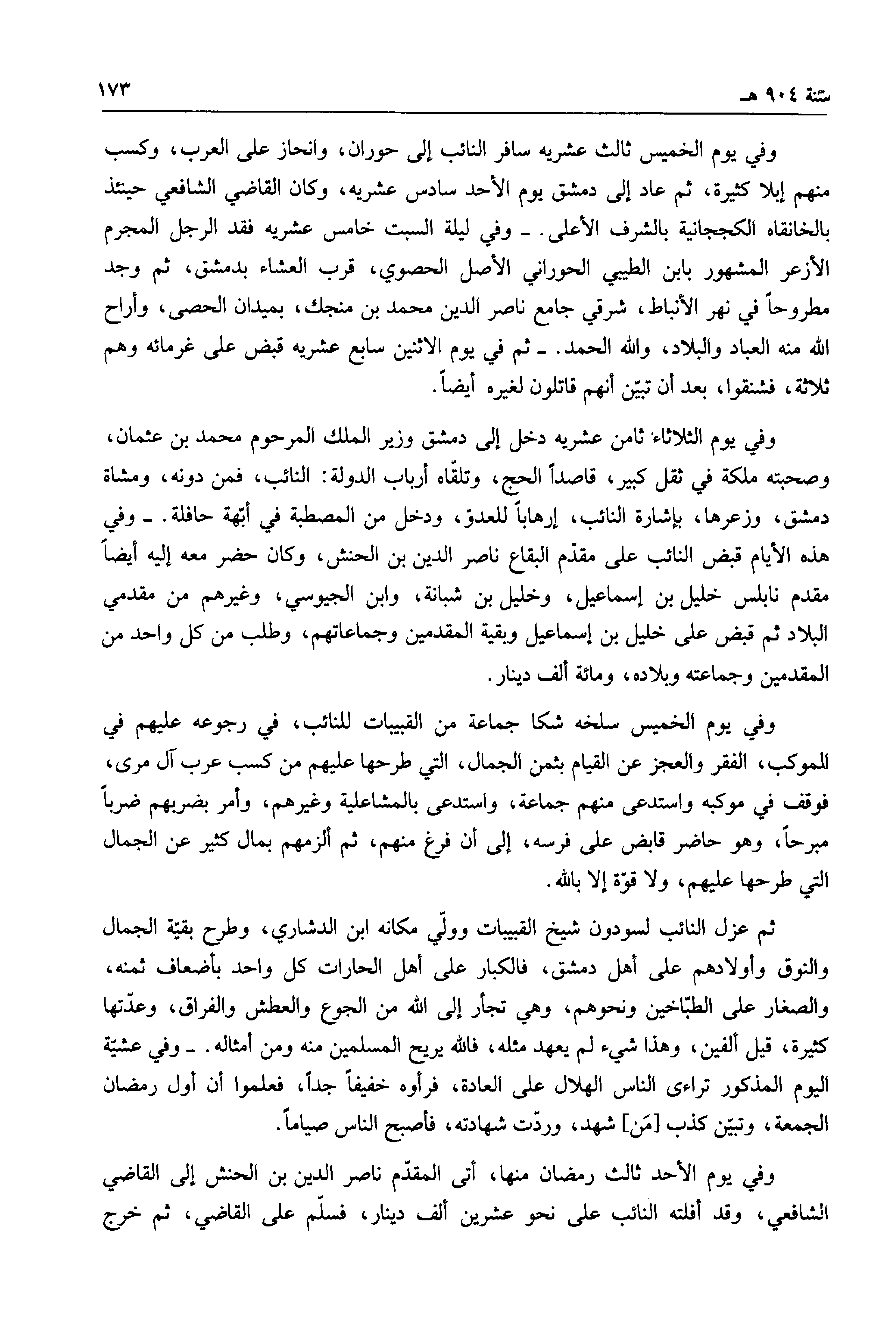 وفي يوم الخميس ثالث عشريه سافر النائب إلى حوران، وانحاز على العرب، وكسب منهم إبلا كثير، ثم عاد إلى دمشق يوم الأحد سادس عشريه، وكان القاضي الشافغي حينئذ بالخانقاه الكججانية بالشرف الأعلى.