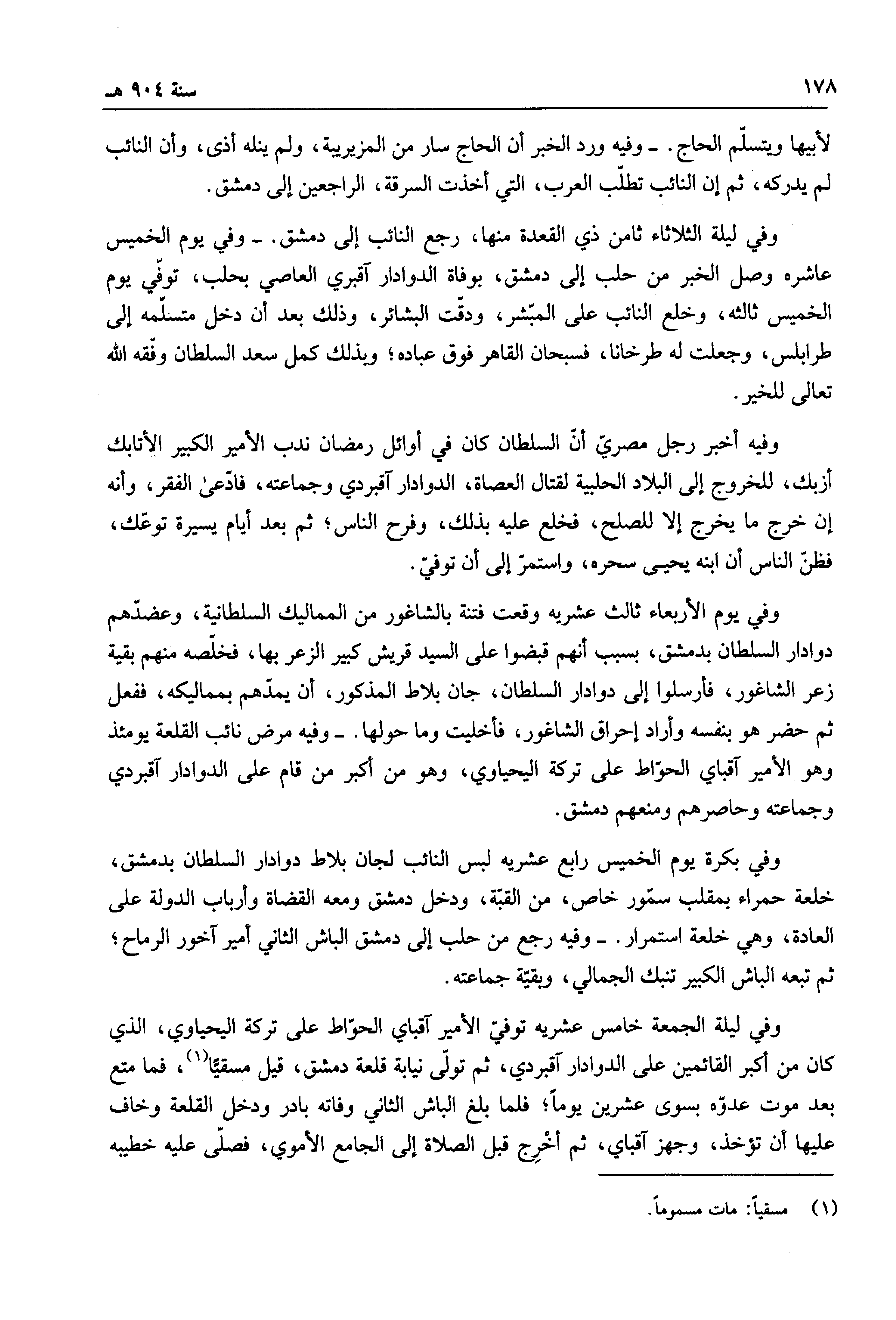 وفي يوم الخميس عاشره وصل الخبر من حلب إلى دمشق، بوفاة الدوادار آقبري العاصي بحلب، توفي يوم الخميس ثالثه، وخلع النائب على المبشر، ودقت البشائر، وذلك بعد أن دخل متسلمه إلى طرابلس، وجعلت له طرخانا، فسبحان القاهر فوق عباده؛ وبذلك كمل سعد السلطان وفقه الله تعالى للخير.