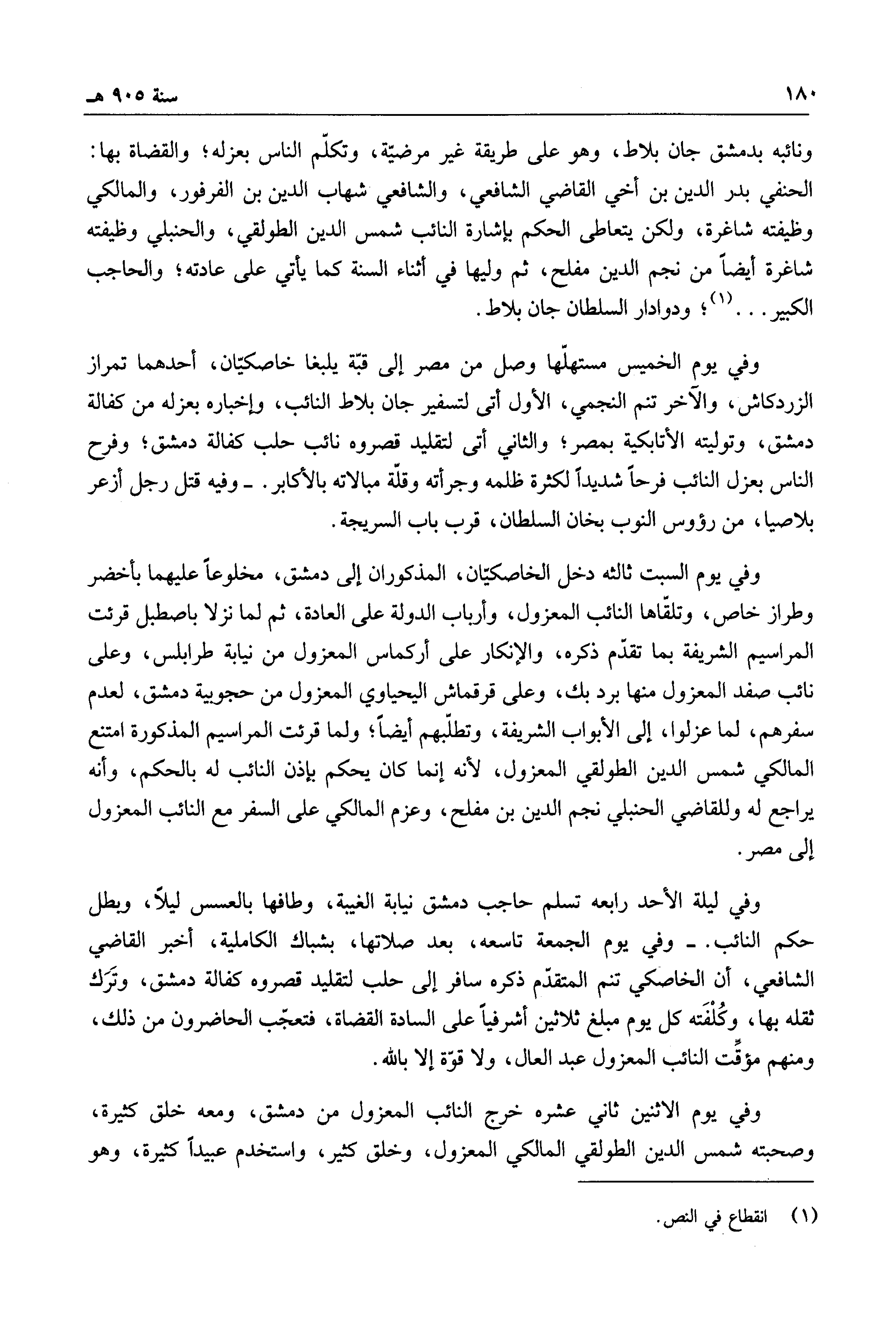 ونائبه بدمشق جان بلاط، وهو على طريقة غير مرضية، وتكلم الناس بعزله؛ والقضاة بها: الحنفي بدر الدين بن أخي القاضي الشافعي، والشافعي شهاب الدين بن الفرفور، والمالكي وظيفته شاغرة، ولكن يتعاطى الحكم بإشارة النائب شمس الدين الطولقي، والحنبلي وظيفته شاغرة أيضاً من نجم الدين مفلح، ثم وليها في أثناء السنة كما يأتي على عادته؛ والحاجب الكبير ... ؛ ودوادار السلطان جان بلاط.