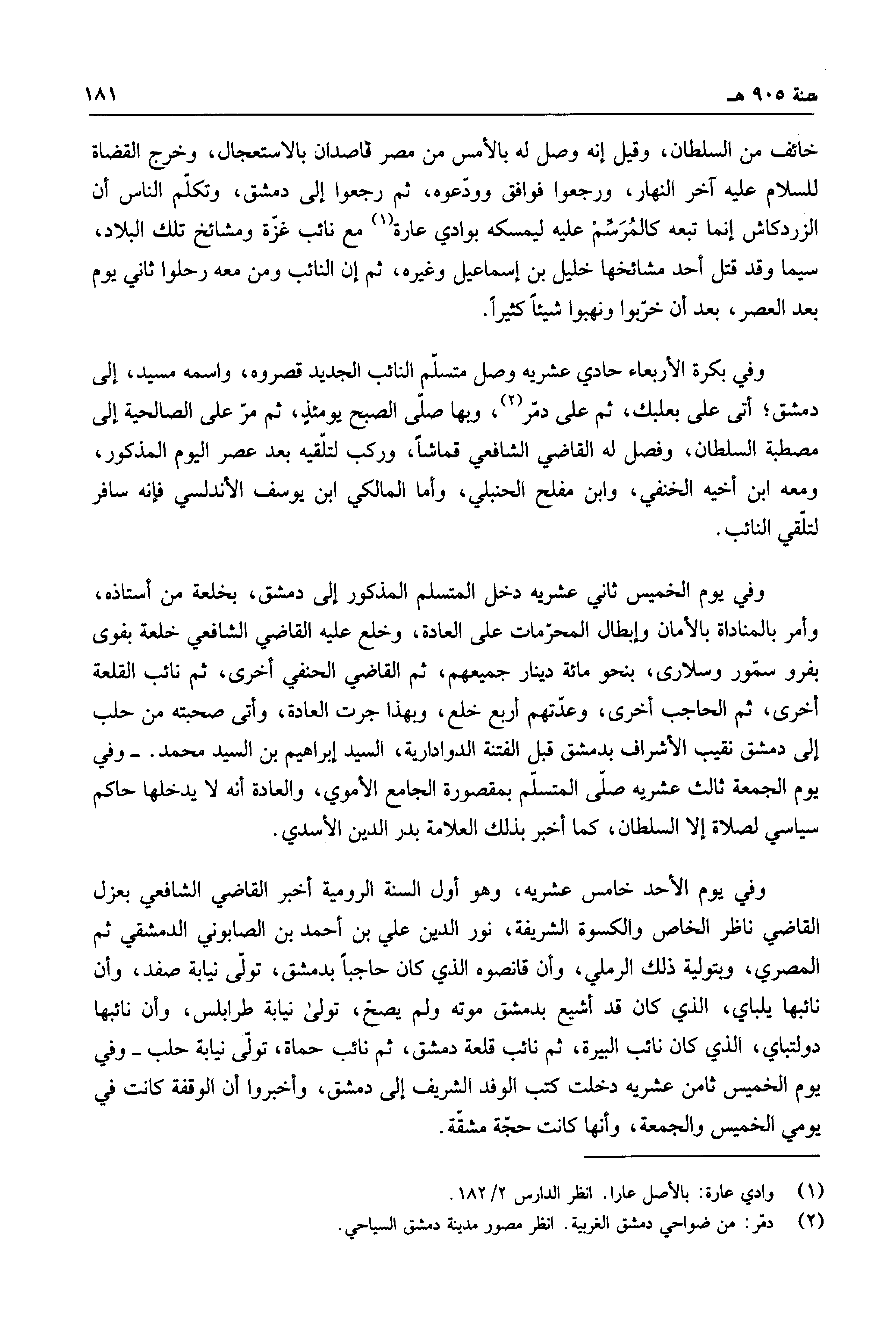 خائف من السلطان، وقيل إنه وصل له بالأمس من مصر قاصدان بالاستعجال، وخرج القضاة للسلام عليه آخر النهار، ورجعوا فوافق وودعوه، ثم رجعوا إلى دمشق، وتكلم الناس أن الزردكاش إنما تبعه كالمرسم عليه ليمسكه بوادي عارة مع نائب غزة ومشائخ تلك البلاد، سيما وقد قتل أحد مشائخها خليل بن إسماعيل وغيره، ثم إن النائب ومن معه رحلوا ثاني يوم بعد العصر، بعد أن خربوا ونهبوا شيئاً كثيراً.