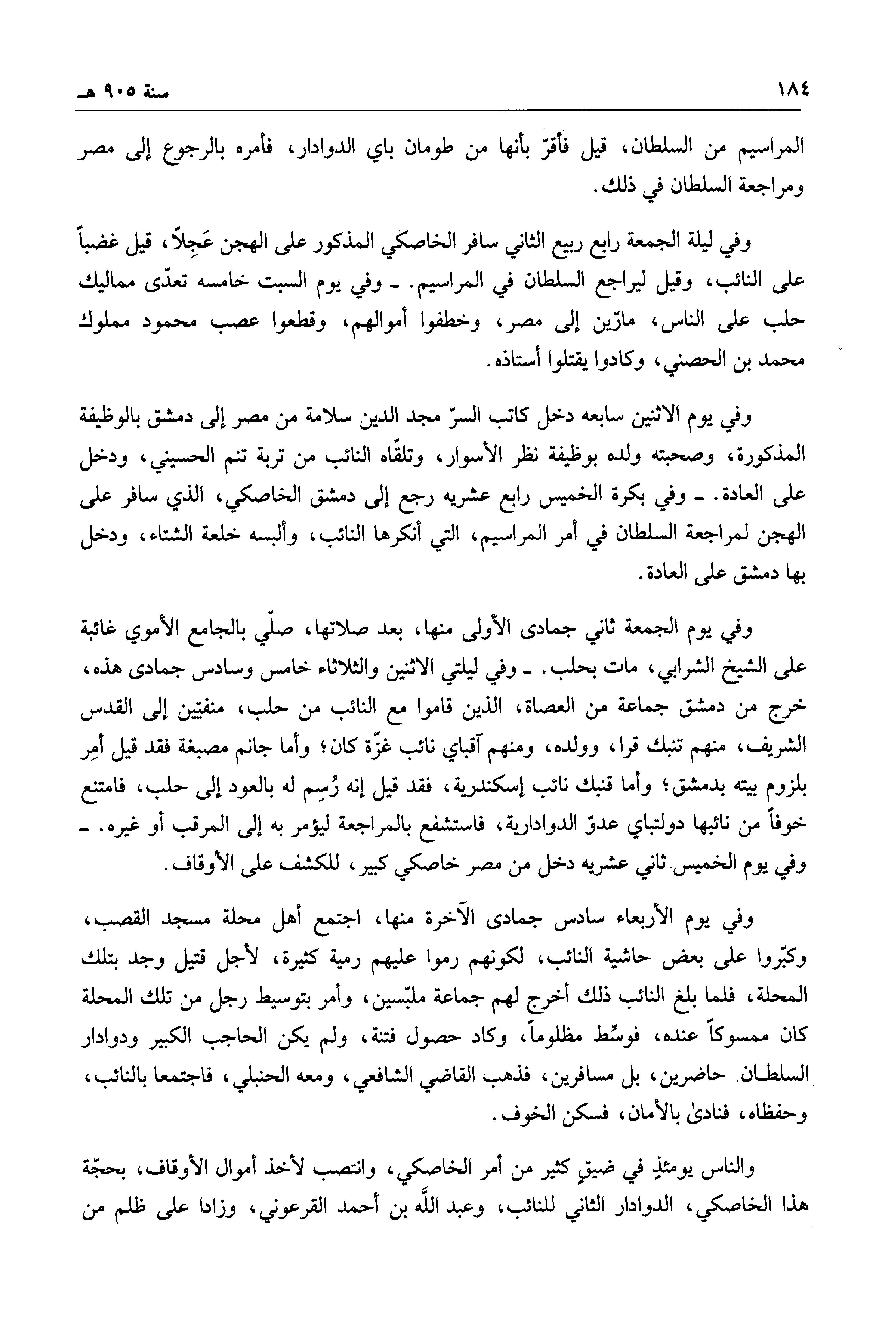 وفي بكرة الخميس رابع عشريه رجع إلى دمشق الخاصكي، الذي سافر على الهجن لمراجعة السلطان في أمر المراسيم، التي أنكرها النائب، وألبسه خلعة الشتاء، ودخل بها دمشق على العادة.
