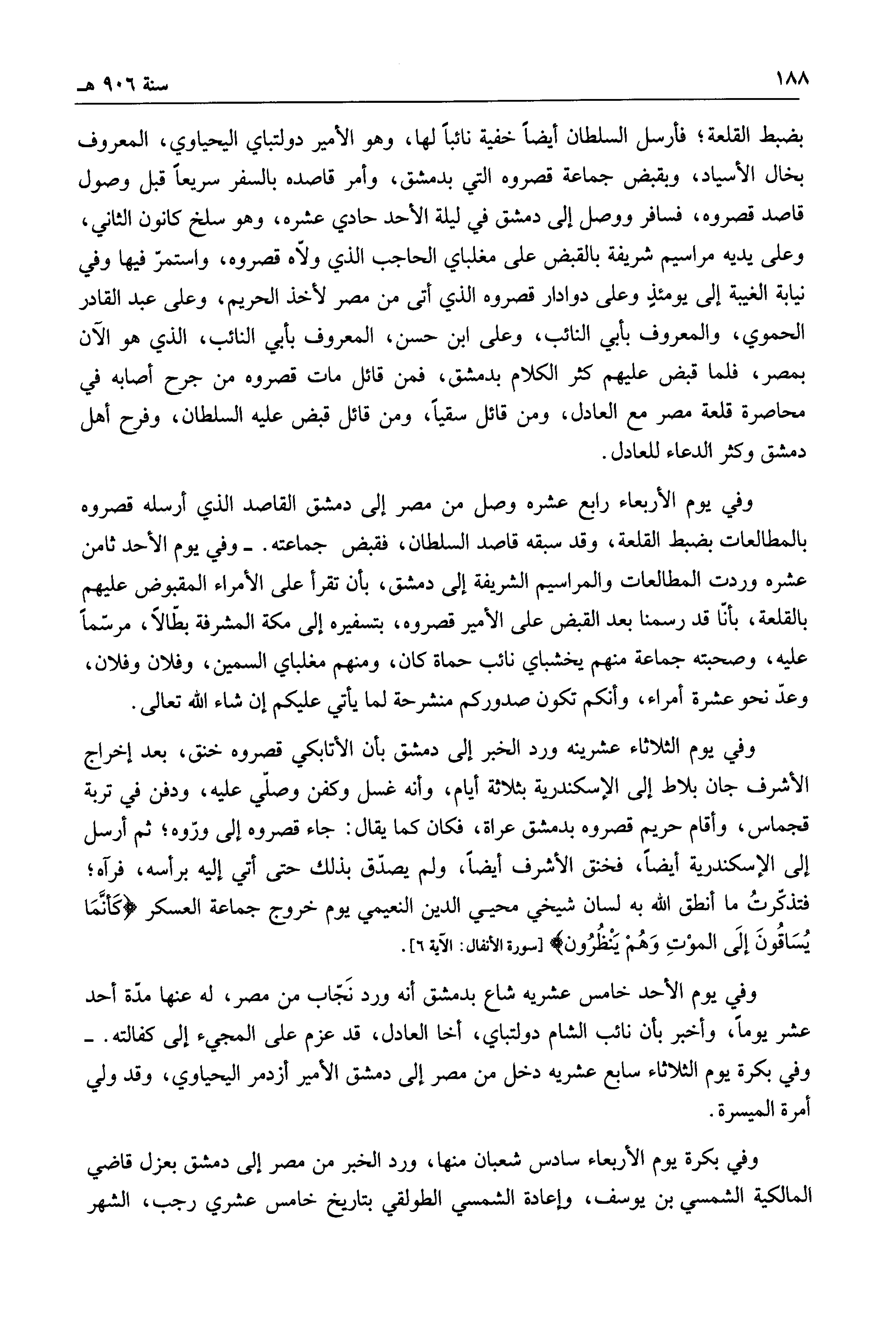 بضبط القلعة؛ فأرسل السلطان أيضاً خفية نائباً لها، وهو الأمير دولتباي اليحياوي، المعروف بخال الأسياد، وبقبض جماعة قصروه التي بدمشق، وأمر قاصده بالسفر سريعاً قبل وصول قاصد قصروه، فستر ووصل إلى دمشق في ليلة الأحد حادي عشره، وهو سلخ كانون الثاني، وعلى يديه مراسيم شريفة بالقبض على مغلباي الحاجب الذي ولاه قصروه، واستمر فيها وفي نيابة الغيبة إلى يومئذٍ وعلى دوادار قصروه الذي أتى من مصر لأخذ الحريم، وعلى عبد القادر الحموي، والمعروف بأبي النائب، وعلى ابن حسن، المعروف بأبي النائب، الذي هو الآن بمصر، فلما قبض عليهم كثر الكلام بدمشق، فمن قائل مات قصروه من جرح أصابه في محاصرة قلعة مصر مع العادل، ومن قائل سقياً، ومن قائل قبض عليه السلطان، وفرح أهل دمشق وكثر الدعاء للعادل.
