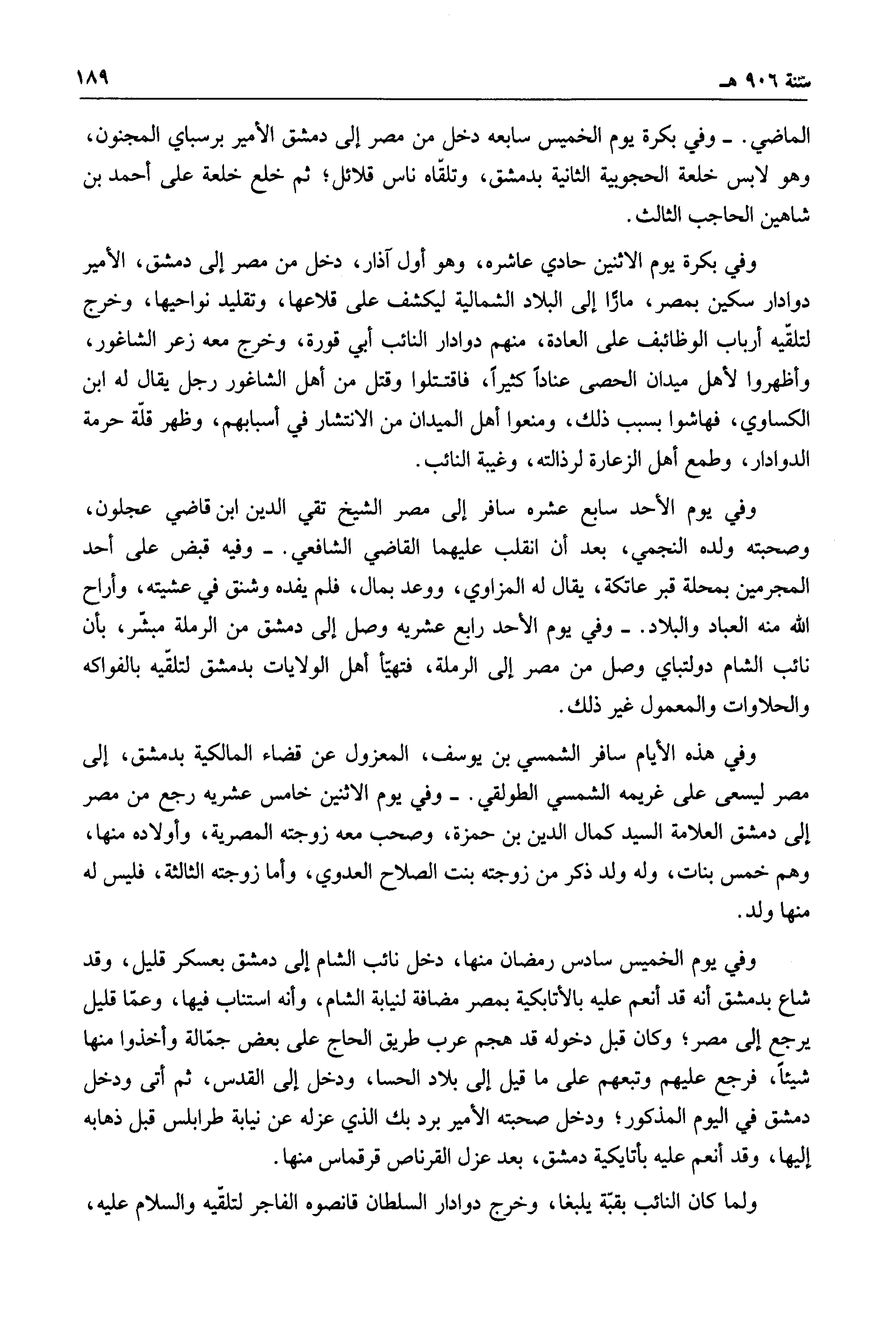 وفي بكرة يوم الخميس سابعه دخل من مصر إلى دمشق الأمير برسباي المجنون، وهو لابس خلعة الحجوبية الثانية بدمشق، وتلقاه ناس قلائل؛ ثم خلع خلعة على أحمد بن شاهين الحاجب الثالث.