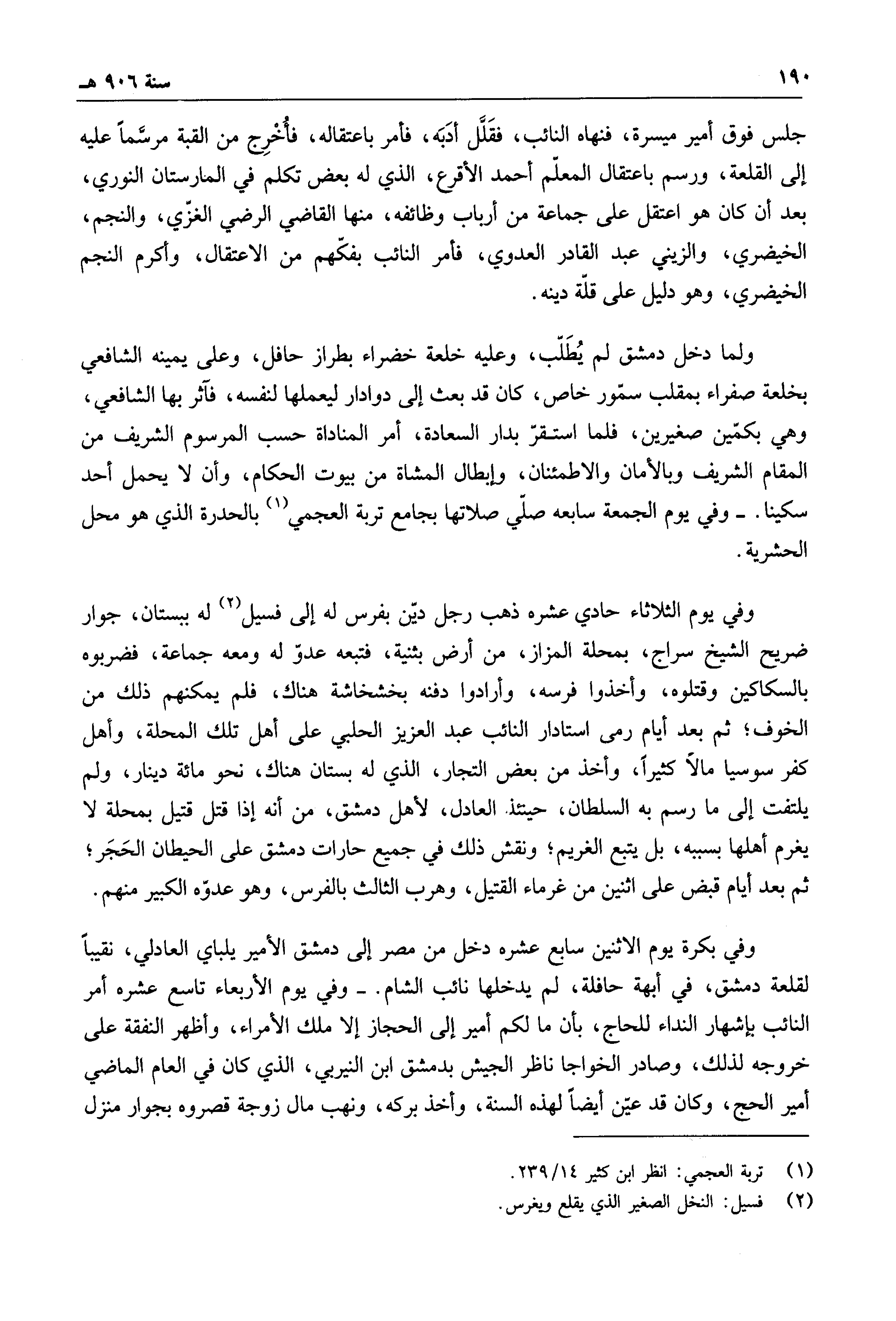 وفي يوم الثلاثاء حادي عشره ذهب رجل دين بفرس له إلى فسيل له ببستان، جوار ضريح الشيخ سراج، بمحلة المزاز، من أرض بثنية، فتبعه عدو له ومعه جماعة، فضربوه بالسكاكين وقتلوه، وأخذوا فرسه، وأرادوا دفنه بخشخاشة هناك، فلم يمكنهم ذلك من الخوف؛ ثم بعد أيام رمى استادار النائب عبد العزيز الحلبي على أهل تلك المحلة، وأهل كفر سوسيا مالاً كثيراً، وأخذ من بعض التجار، الذي له بستان هناك، نحو مائة دينار، ولم يلتفت إلى ما رسم به السلطان، حينئذ العادل، لأهل دمشق، من أنه إذا قتل قتيل بمحلة لا يغرم أهلها بسببه، بل يتبع الغريم؛ ونقش ذلك في جميع حارات دمشق على الحيطان الحجر؛ ثم بعد أيام قبض على اثنين من غرماء القتيل، وهرب الثالث بالفرس، وهو عدوه الكبير منهم.