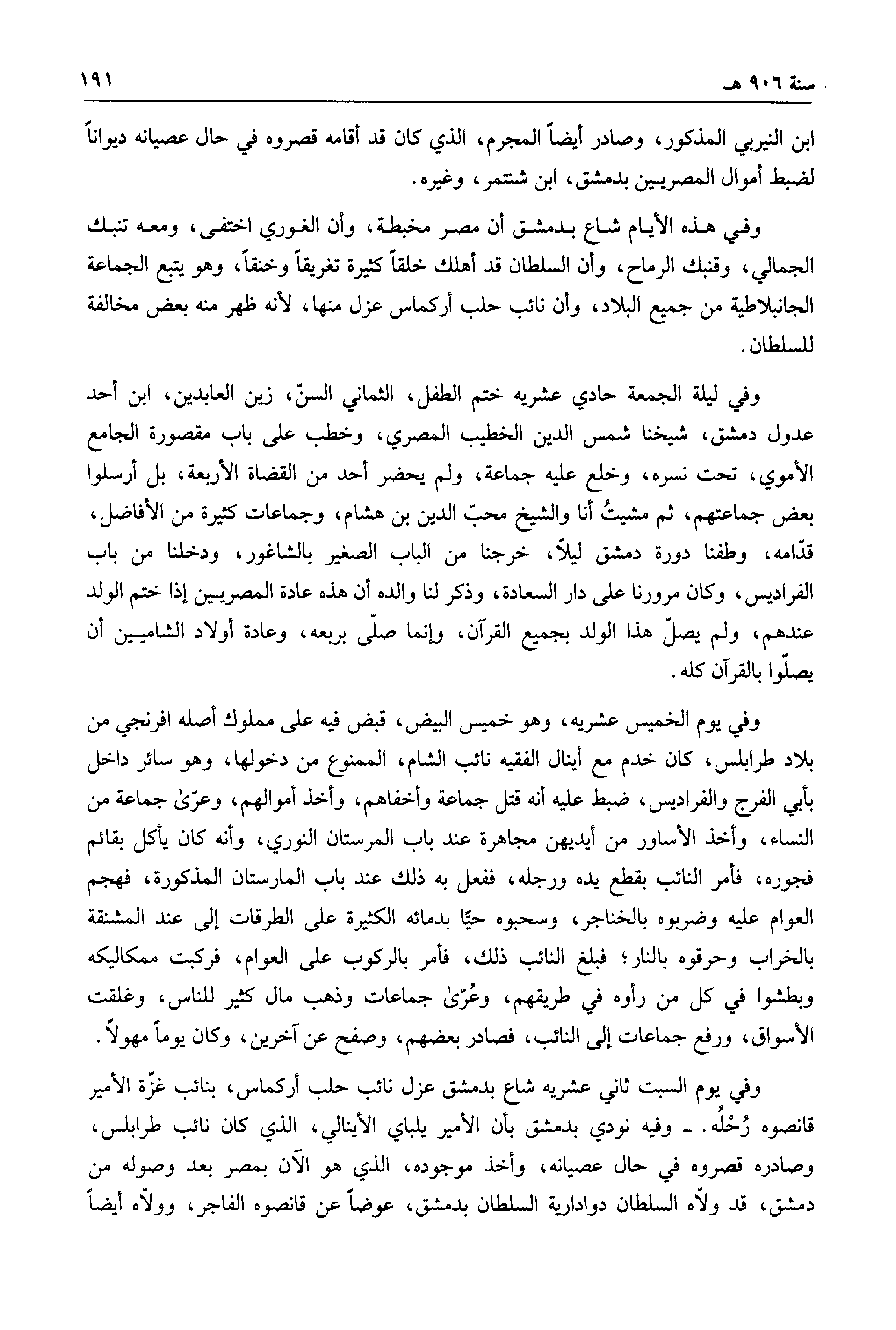 وفي هذه الأيام شاع بدمشق أن مصر مخبطة، وأن الغوري اختفى، ومعه تنبك الجمالي، وقنبك الرماح، وأن السلطان قد أهلك خلقاً كثيراً تغريقاً وخنقاً، وهو يتبع الجماعة الجانبلاطية من جميع البلاد، وأن نائب حلب أركماس عزل منها، لأنه ظهر منه بعض مخالفة للسلطان.