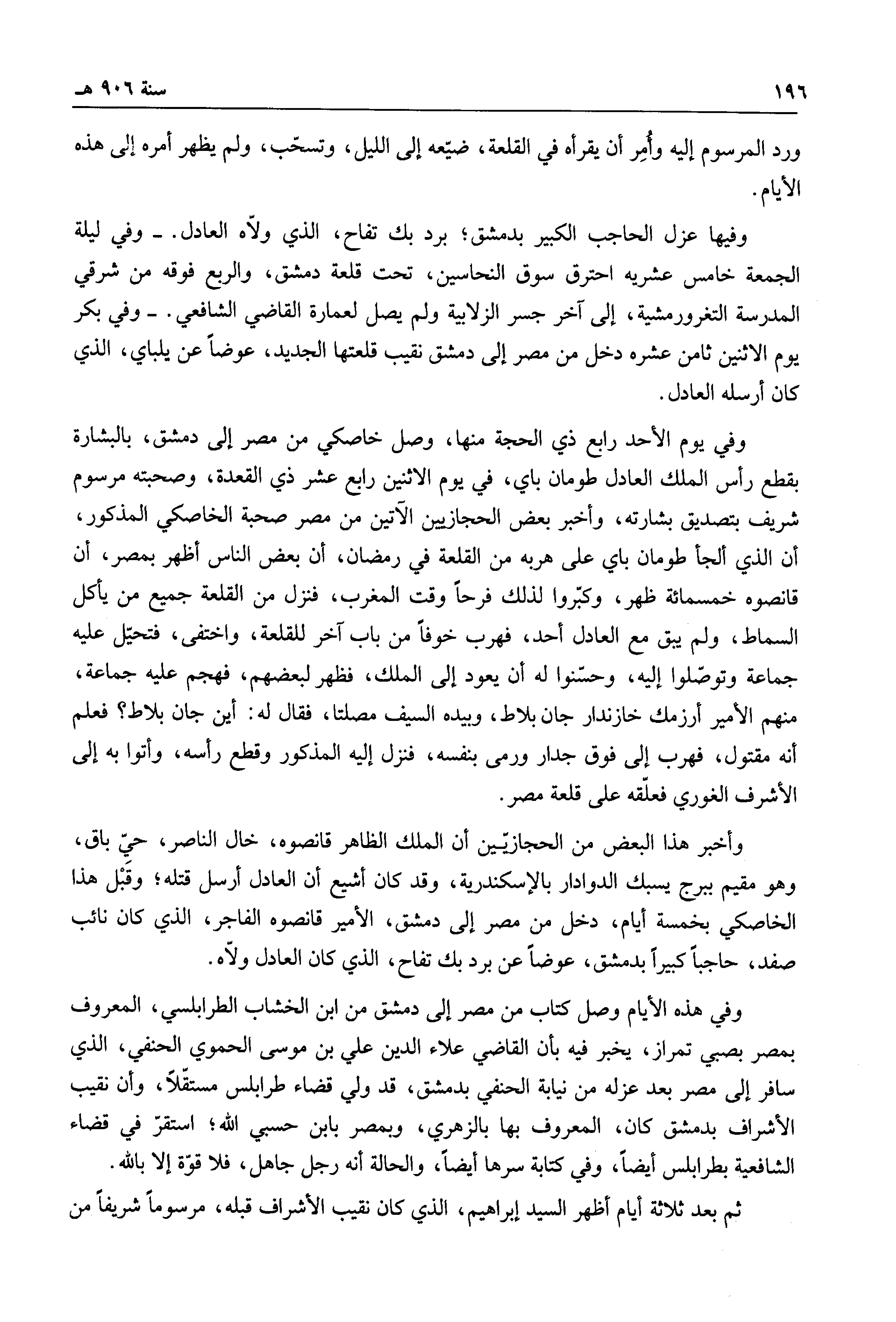 وأخبر هذا البعض من الحجازيين أن الملك الظاهر قانصوه، خال الناصر، حي باق، وهو مقيم ببرج يسبك الدوادار بالإسكندرية، وقد كان أشيع أن العادل أرسل قتله؛ وقبل هذا الخاصكي بخمسة أيام، دخل من مصر إلى دمشق، الأمير قانصوه الفاجر، الذي كان نائب صفد، حاجباً كبيراً بدمشق، عوضاً عن برد بك تفاح، الذي كان العادل ولاه.