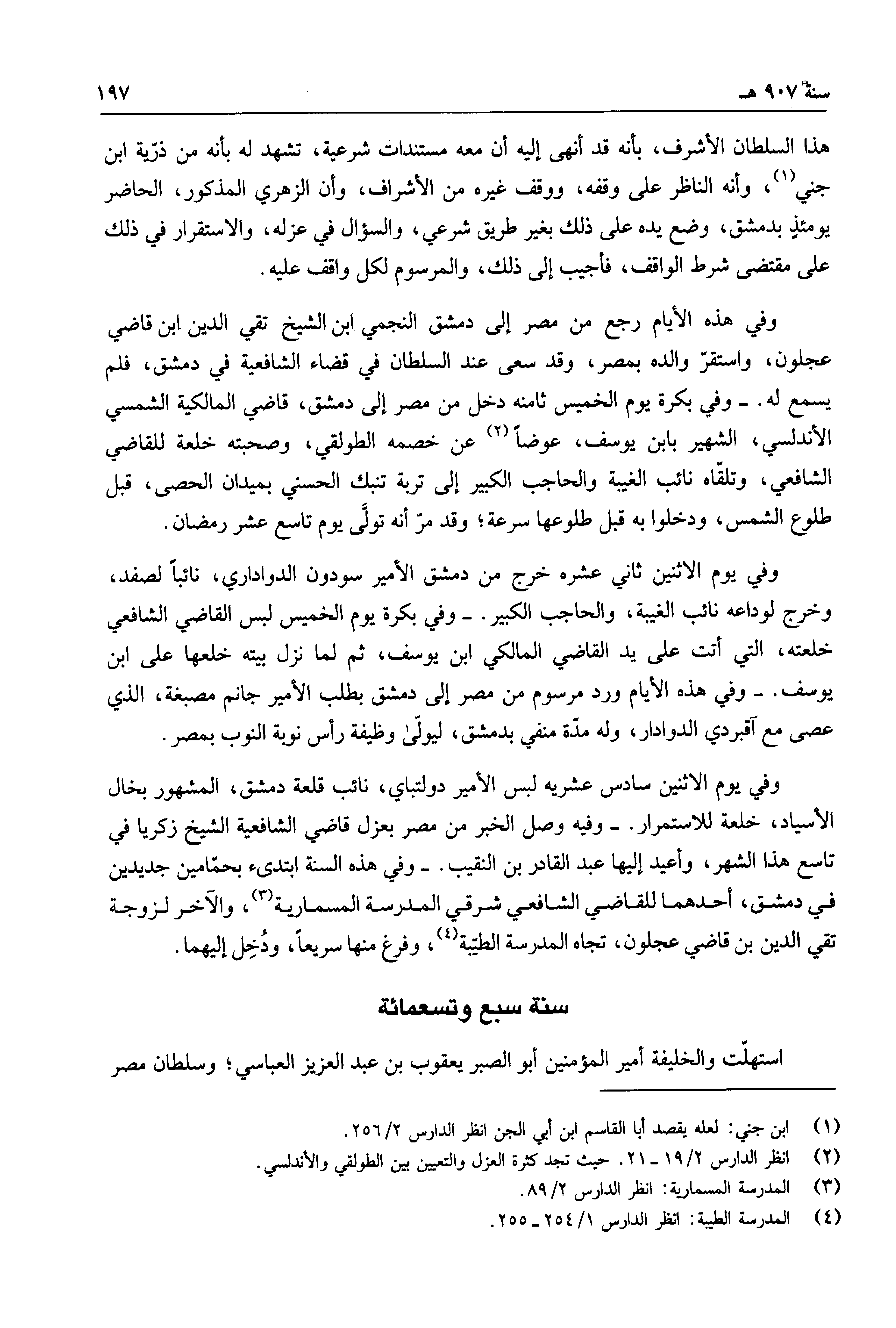 وفي هذه الأيام رجع من مصر إلى دمشق النجمي ابن الشيخ تقي الدين ابن قاضي عجلون، واستقر والده بمصر، وقد سعى عند السلطان في قضاء الشافعية في دمشق، فلم يسمع له.