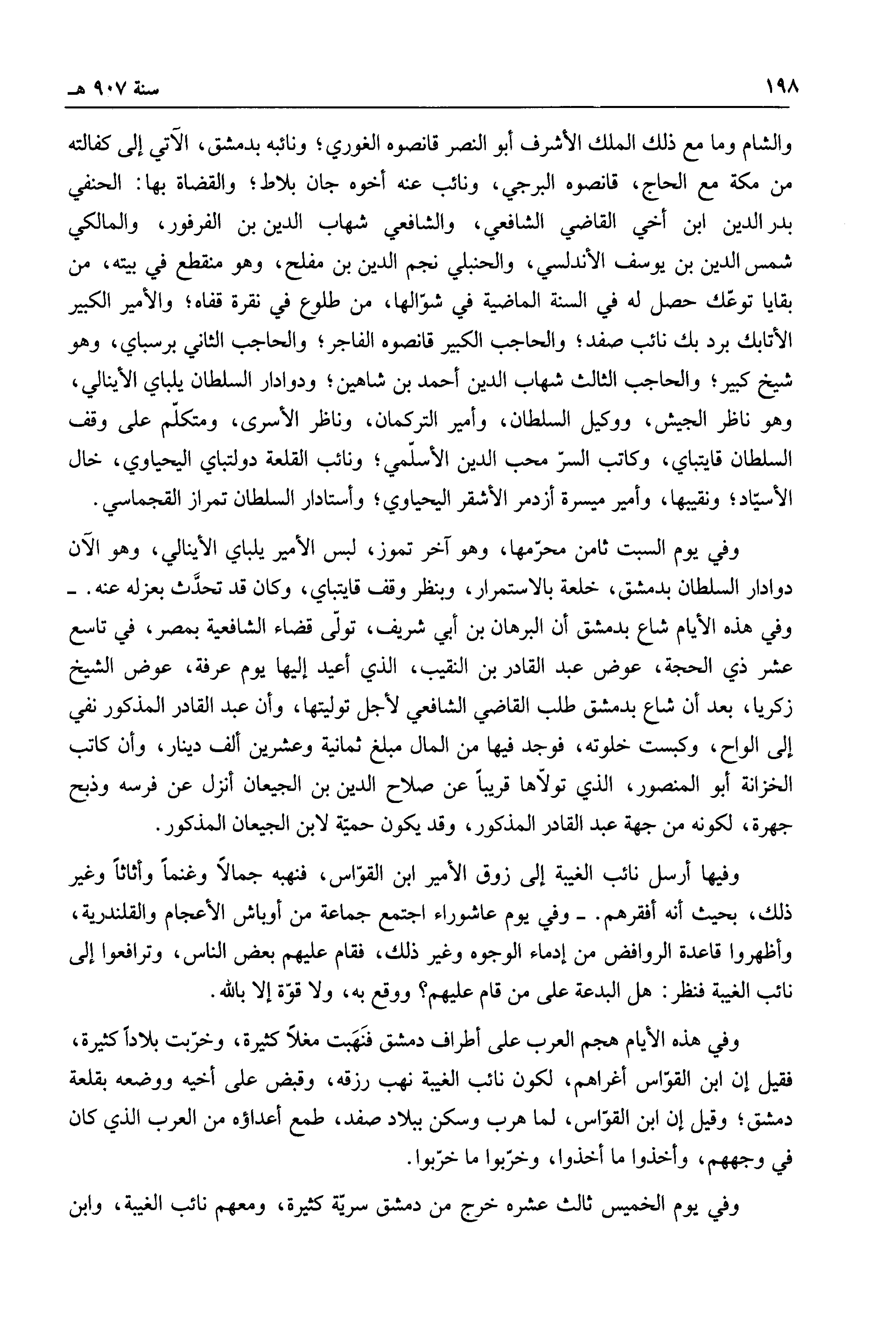 والشام وما مع ذلك الملك الأشرف أبو النصر قانصوه الغوري؛ ونائبه بدمشق، الآتي إلى كفالته من مكة مع الحاج، قانصوه البرجي، ونائب عنه أخوه جان بلاط؛ والقضاة بها: الحنفي بدر الدين ابن أخي القاضي الشافعي، والشافعي شهاب الدين بن الفرفور، والمالكي شمس الدين بن يوسف الأندلسي، والحنبلي نجم الدين بن مفلح، وهو منقطع في بيته، من بقايا توعك حصل له في السنة الماضية في شوالها، من طلوع في نقرة قفاه؛ والأمير الكبير الأتابك برد بك نائب صفد؛ والحاجب الكبير قانصوه الفاجر؛ والحاجب الثاني برسباي، وهو شيخ كبير؛ والحاجب الثالث شهاب الدين أحمد بن شاهين؛ ودوادار السلطان يلباي الأينالي، وهو ناظر الجيش، ووكيل السلطان، وأمير التركمان، وناظر الأسرى، ومتكلم على وقف السلطان قايتباي، وكاتب السر محب الدين الأسلمي؛ ونائب القلعة دولتباي اليحياوي، خال الأسياد؛ ونقيبها، وأمير ميسرة أزدمر الأشقر اليحياوي؛ وأستادار السلطان تمراز القجماسي.