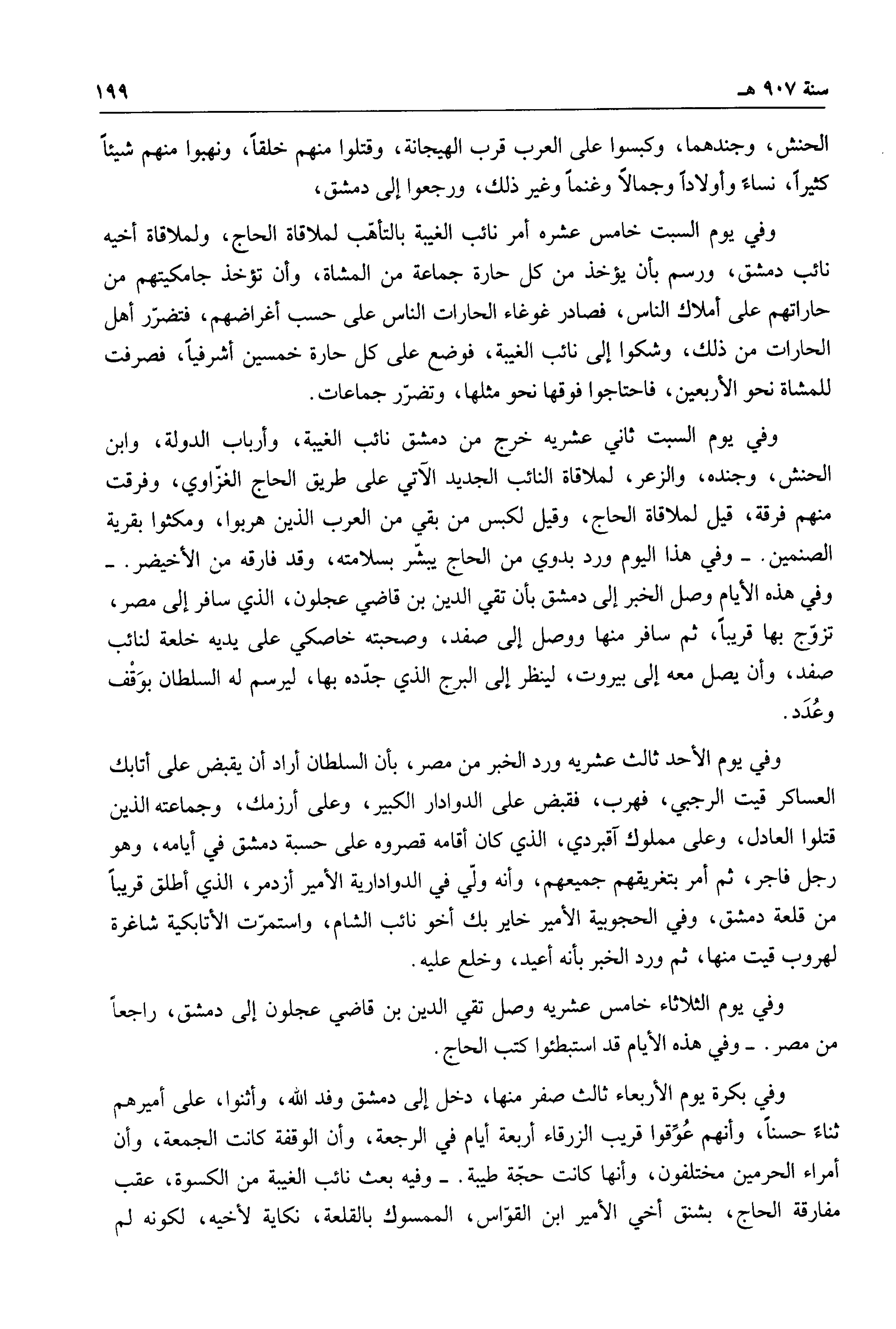 الحنش، وجندهما، وكبسوا على العرب قرب الهيجانة، وقتلوا منهم خلقاً، ونهبوا منهم شيئاً كثيراً، نساءً وأولاداً وجمالاً وغنماً غير ذلك، ورجعوا إلى دمشق، وفي يوم السبت خامس عشره أمر نائب الغيبة بالتأهب لملاقاة الحاج، ولملاقاة أخيه نائب دمشق، ورسم بأن يؤخذ من كل حارة جماعة من المشاة، أن تأخذ جامكيتهم من حاراتهم على أملاك الناس، فصادر غوغاء الحارات الناس على حسب أغراضهم، فتضرر أهل الحارات من ذلك، وشكوا إلى نائب الغيبة، فوضع على كل حارة خمسين أشرفياً، فصرفت للمشاة نحو الأربعين، فاحتاجوا فوقها نحو مثلها، وتضرر جماعات.