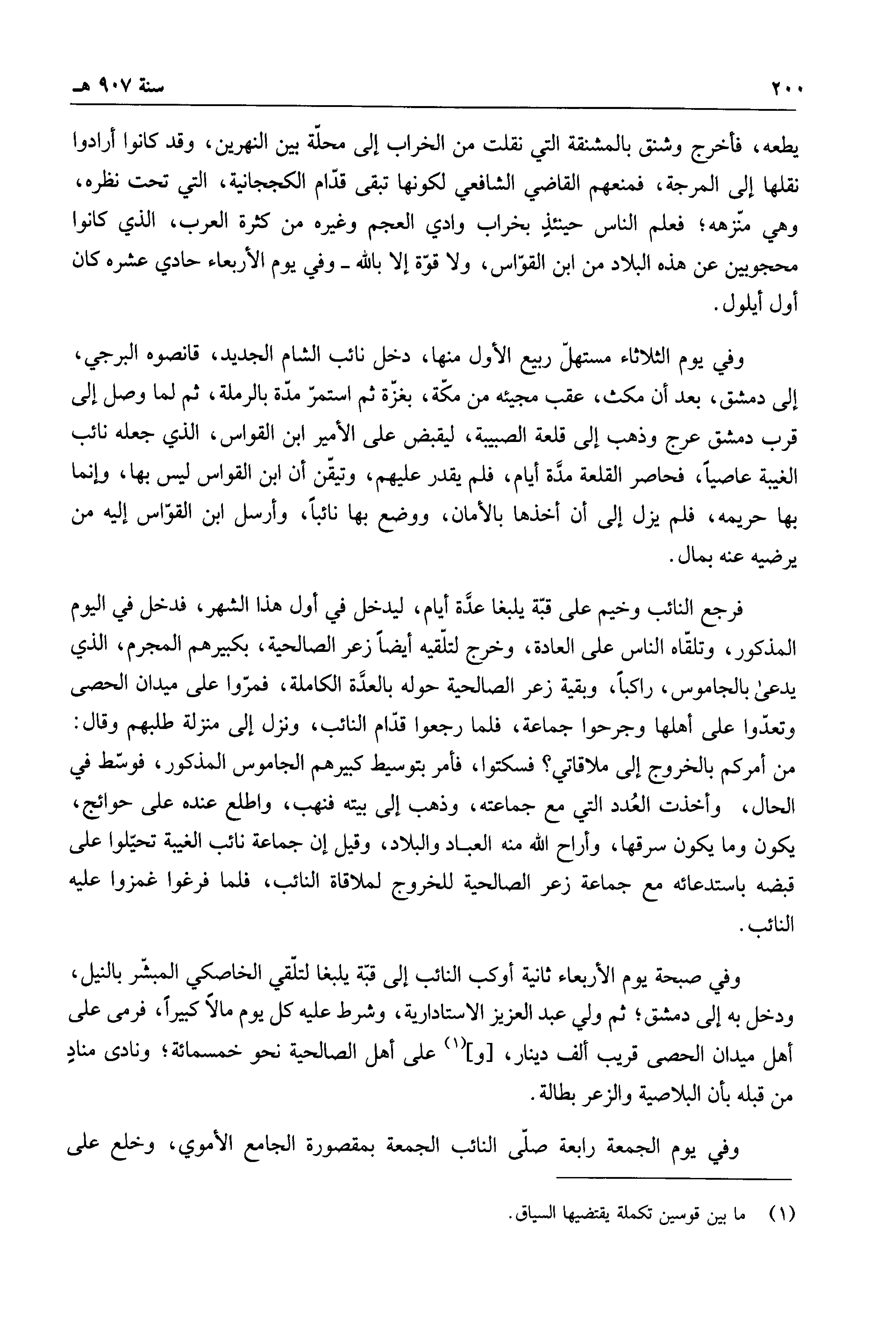 يطعه، فأخرج وشنق بالمشنقة التي نقلت من الخراب إلى محلة بين النهرين، وقد كانوا أرادوا نقلها إلى المرجة، فمنعهم القاضي الشافعي لكونها تبقى قدام الكججانية، التي تحت نظره، وهي منزهه؛ فعلم الناس حينئذٍ بخراب وادي العجم وغيره من كثرة العرب، الذي كانوا محجوبين عن هذه البلاد من ابن القواس، ولا قوة إلا بالله.