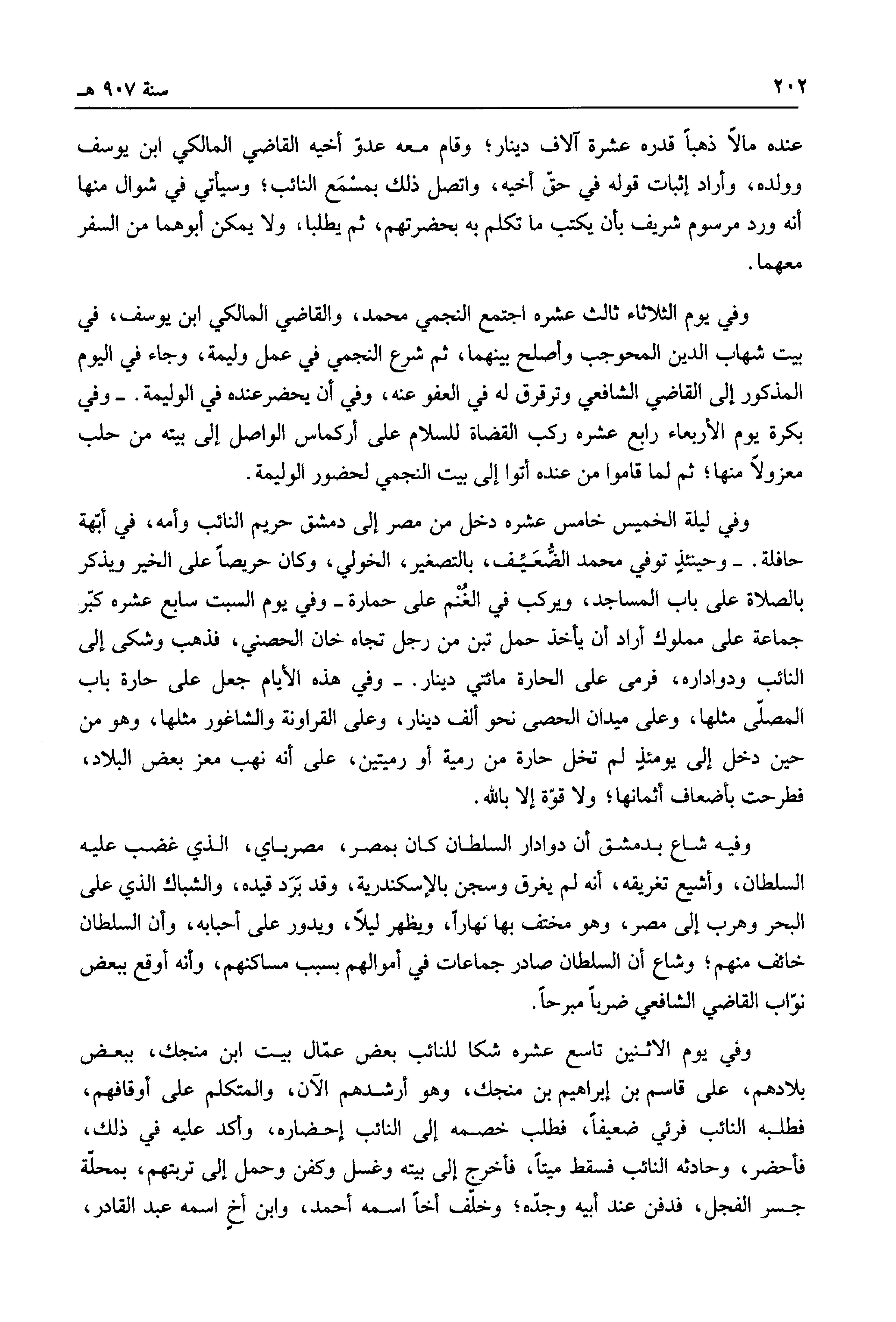 عنده مالاً ذهباً قدره عشرة آلاف دينار؛ وقام معه عدو أخيه القاضي المالكي ابن يوسف، وولده، وأراد إثبات قوله في حق أخيه، واتصل ذلك بمسمع النائب؛ وسيأتي في شوال منها أنه ورد مرسوم شريف بأن يكتب ما تكلم به بحضرتهم، ثم يطلبا، ولا يمكن أبوهما من السفر معهما.