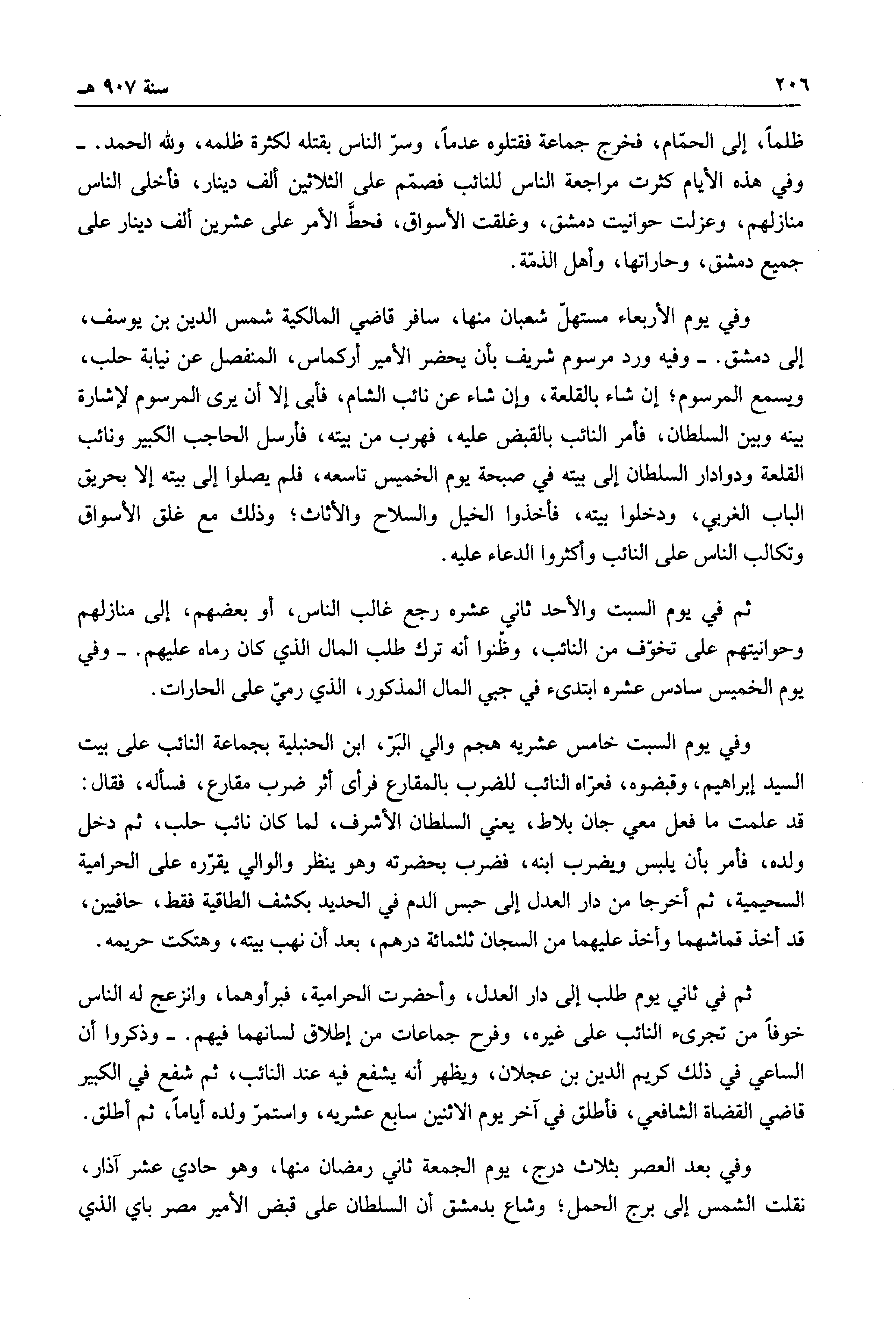 ثم في يوم السبت والأحد ثاني عشره رجع غالب الناس، أو بعضهم، إلى منازلهم وحوانيتهم على تخوف من النائب، وظنوا أنه ترك طلب المال الذي كان رماه عليهم.