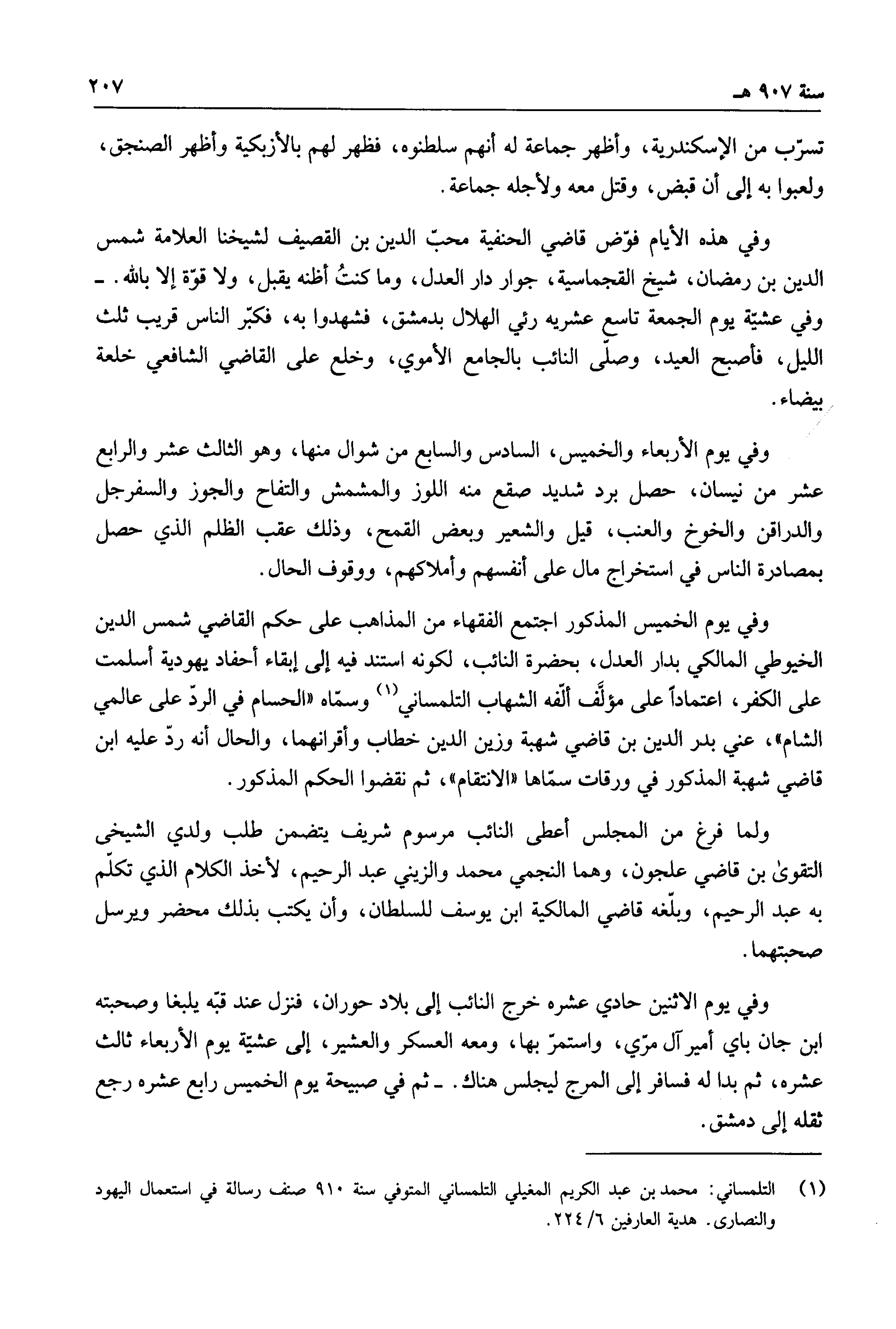 وفي يوم الخميس المذكور اجتمع الفقهاء من المذاهب على حكم القاضي شمس الدين الخيوطي المالكي بدار العدل، بحضرة النائب، لكونه استند فيه إلى إبقاء أحفاد يهودية أسلمت على الكفر، اعتماداً على مؤلف ألفه الشهاب التلمساني وسماه الحسام في الرد على عالمي الشام، عني بدر الدين بن قاضي شهبة وزين الدين خطاب وأقرانهما، والحال أنه رد عليه ابن قاضي شهبة المذكور في ورقات سماها الانتقام، ثم نقضوا الحكم المذكور.