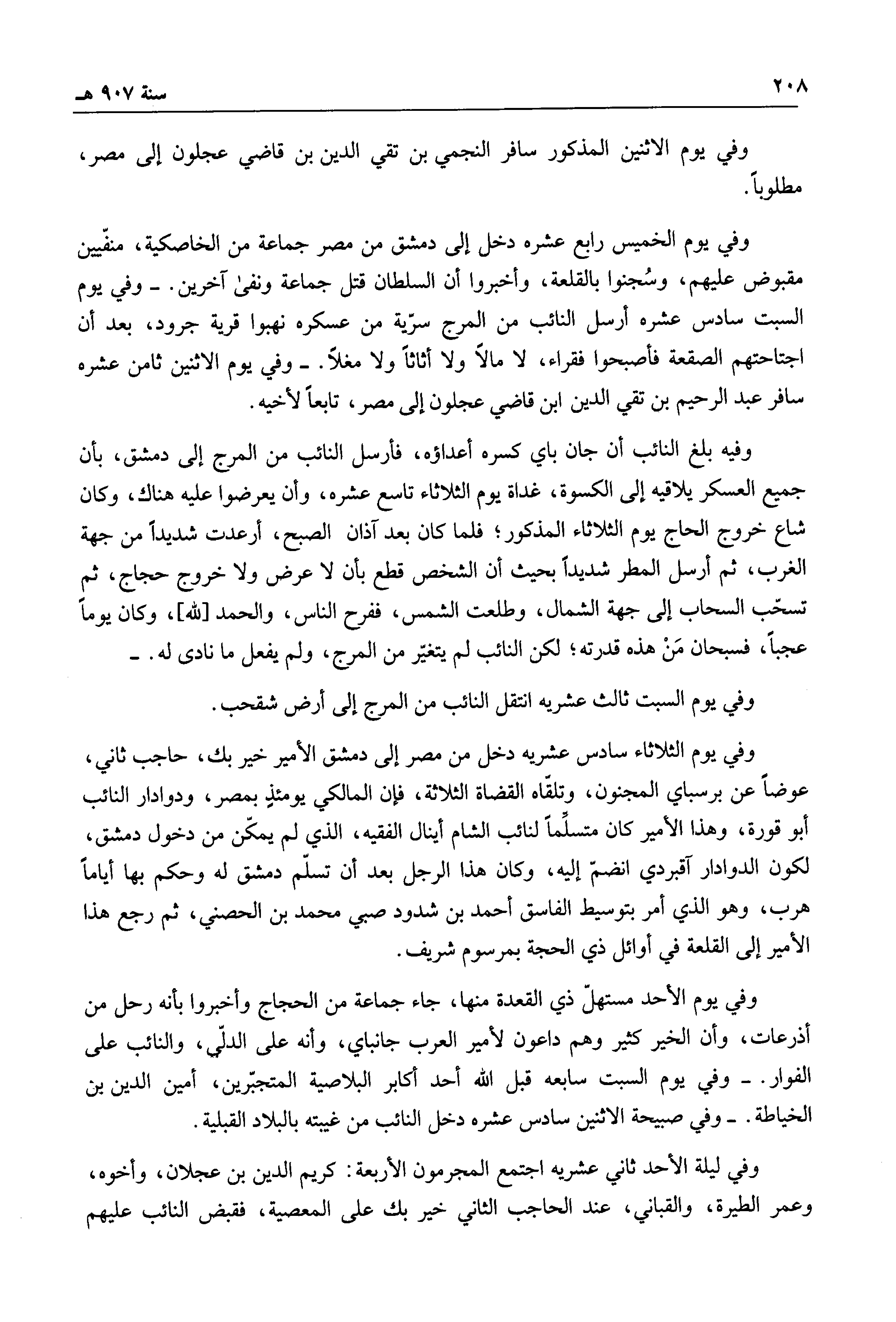 وفي يوم الخميس رابع عشره دخل إلى دمشق من مصر جماعة من الخاصكية، منفيين مقبوض عليهم، وسجنوا بالقلعة، وأخبروا أن السلطان قتل جماعة ونفى آخرين.
