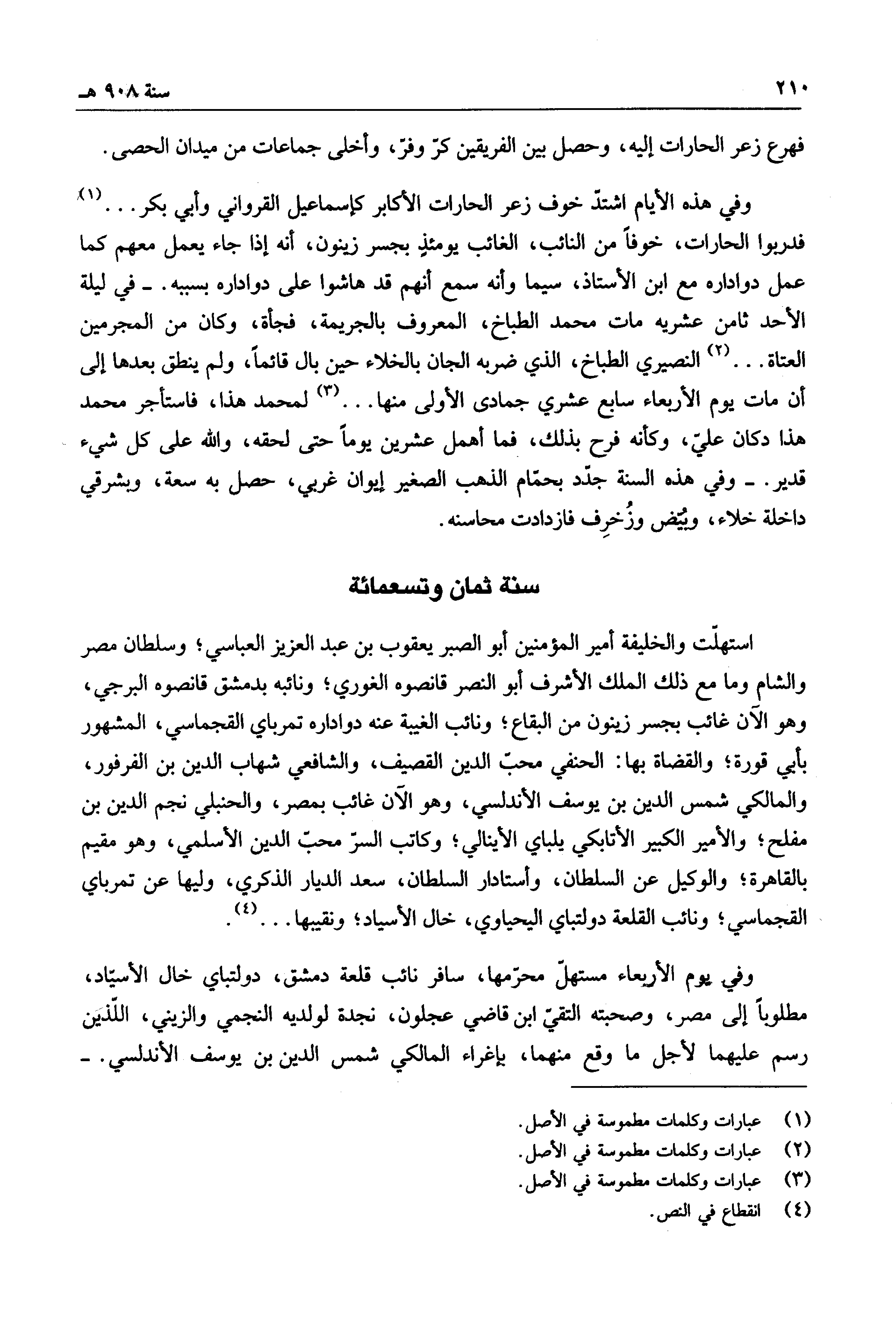 استهلت والخليفة أمير المؤمنين أبو الصبر يعقوب بن عبد العزيز العباسي؛ وسلطان مصر والشام وما مع ذلك الملك الأشرف أبو النصر قانصوه الغوري؛ ونائبه بدمشق قانصوه البرجي، وهو الآن غائب بجسر زينزن من البقاع؛ ونائب الغيبة عنه دواداره تمرباي القجماسي، المشهور بأبي قورة؛ والقضاة بها: الحنفي محب الدين القصيف، والشافعي محب الدين بن الفرفور، والمالكي شمس الدين بن يوسف الأندلسي، وهو الآن غائب بمصر، والحنبلي نجم الدين بن مفلح؛ والأمير الكبير الأتابكي يلباي الأينالي؛ وكاتب السر محب الدين الأسلمي، وهو مقيم بالقاهرة؛ والوكيل عن السلطان، وأستادار السلطان، سعد الديار الذكري، وليها عن تمرباي القجماسي؛ ونائب القلعة دولتباي اليحياوي، خال الأسياد؛ ونقيبها....