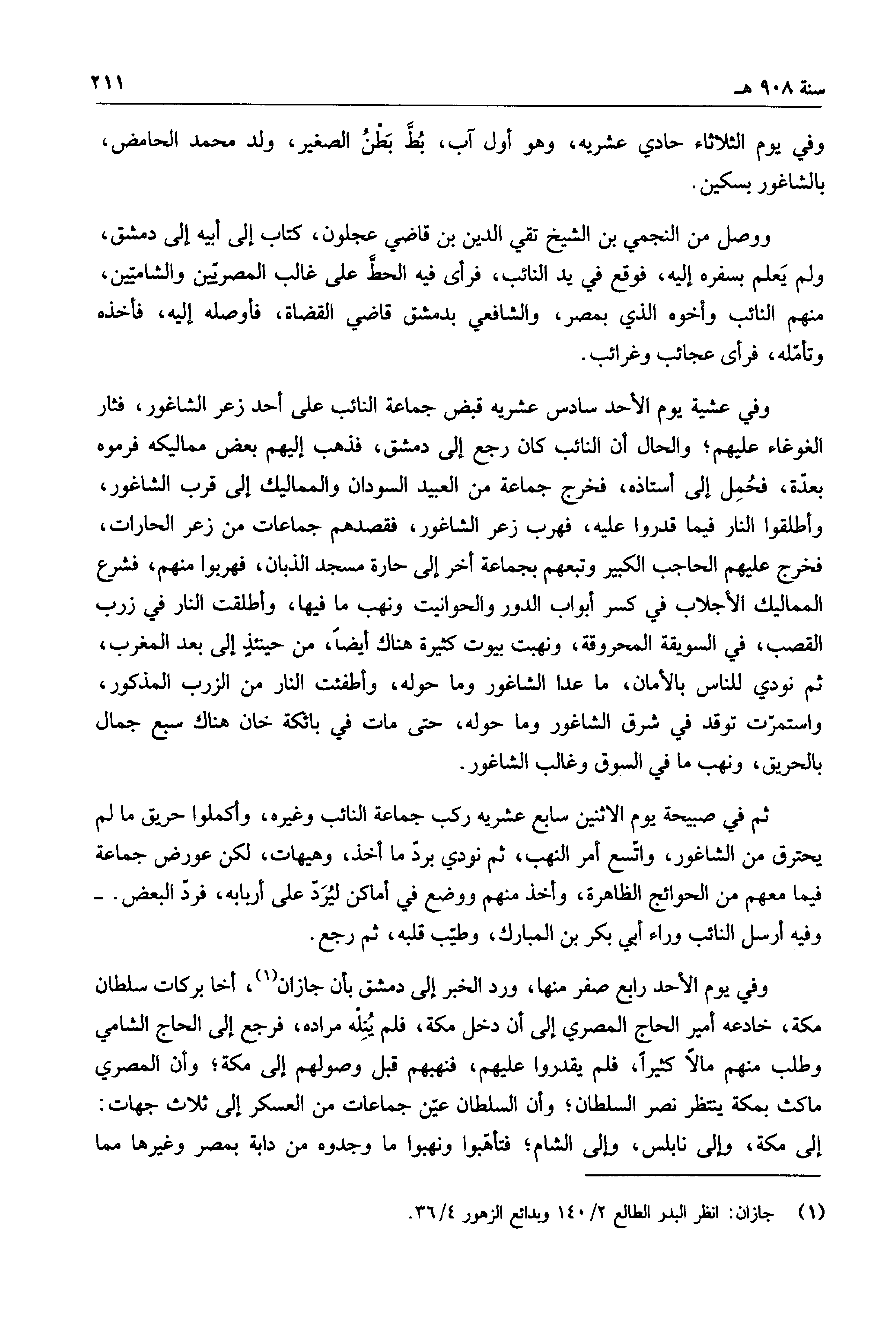 وفي يوم الأحد رابع صفر منها، ورد الخبر إلى دمشق بأن جازان، أخا بركات سلطان مكة، خادعه أمير الحاج المصري إلى أن دخل مكة، فلم ينله مراده، فرجع إلى الحاج الشامي وطلب منهم مالاً كثيراً، فلم يقدروا عليهم، فنهبهم قبل وصولهم إلى مكة؛ وأن المصري ماكث بمكة ينتظر نصر السلطان؛ وأن السلطان عين جماعات من العسكر إلى ثلاث جهات: إلى مكة، وإلى نابلس، وإلى الشام؛ فتأهبوا ونهبوا ما وجدوه من دابة بمصر وغيرها مما