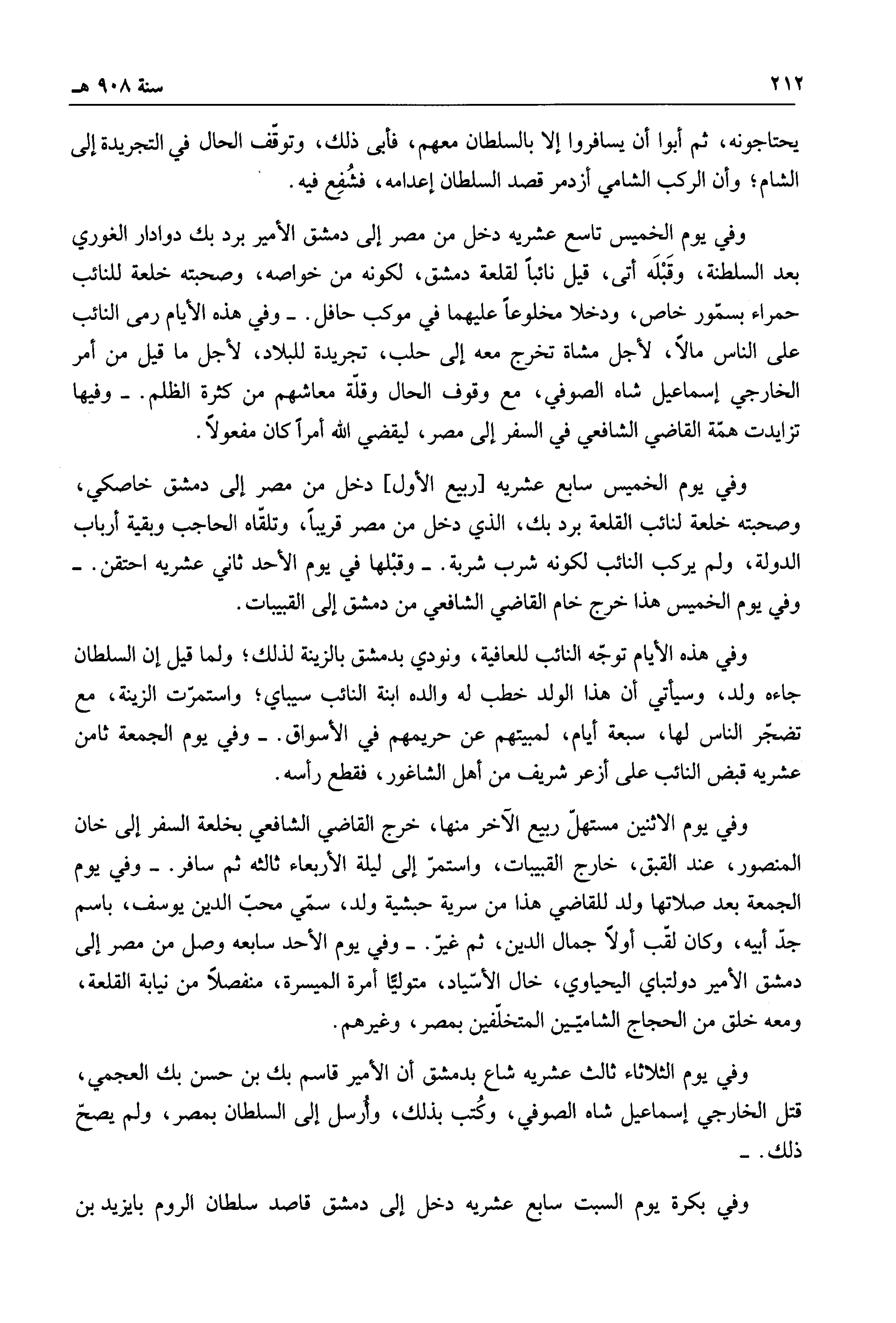 وفي يوم الخميس تاسع عشريه دخل من مصر إلى دمشق الأمير برد بك دوادار الغوري بعد السلطنة، وقبله أتى، قيل نائباً لقلعة دمشق، لكونه من خواصه، وصحبته خلعة للنائب حمراء بسمور خاص، ودخلا مخلوعاً عليهما في موكب حافل.