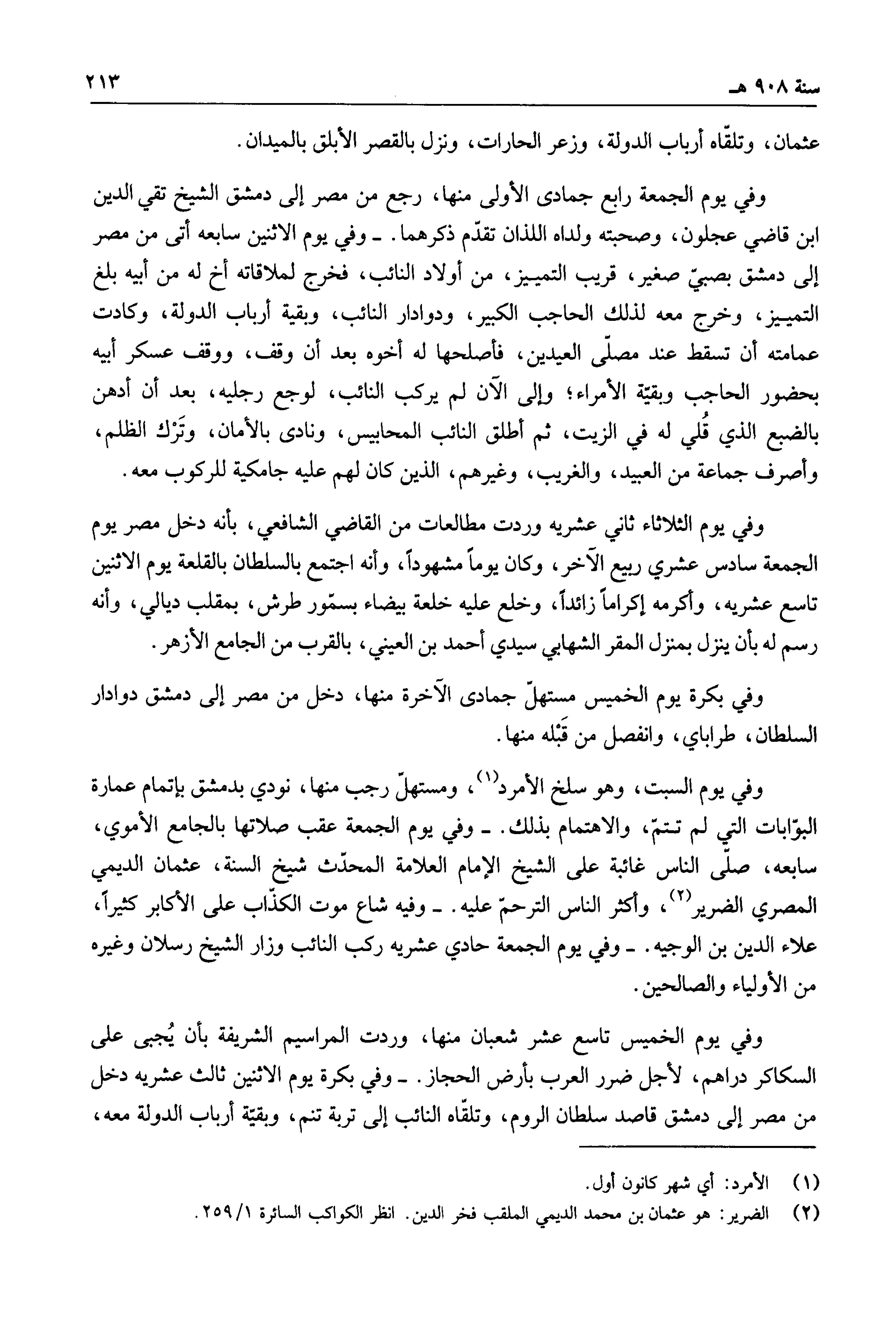 وفي يوم الجمعة رابع جمادى الأولى منها، رجع من مصر إلى دمشق الشيخ تقي الدين ابن قاضي عجلون، وصحبته ولداه اللذان تقدم ذكرهما.