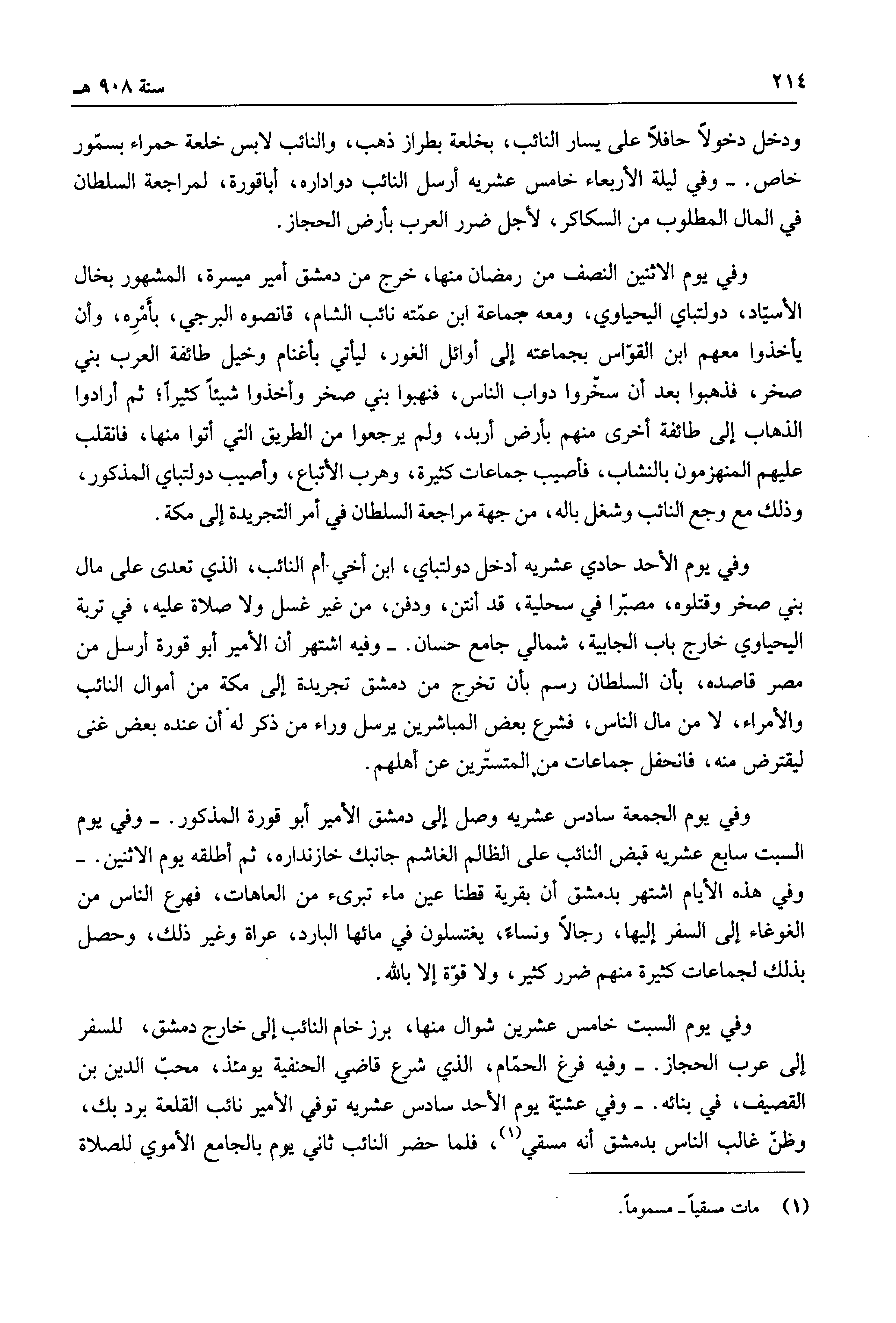 وفي يوم الاثنين النصف من رمضان منها، خرج من دمشق أمير ميسرة، المشهور بخال الأسياد، دولتباي اليحياوي، ومعه جماعة ابن عمته نائب الشام، قانصوه البرجي، بأمره، وأن يأخذوا معهم ابن القواس بجماعته إلى أوائل الغور، ليأتي بأغنام وخيل طائفة العرب بني صخر، فذهبوا بعد أن سخروا دواب الناس، فنهبوا بني صخر وأخذوا شيئاً كثيراً؛ ثم أرادوا الذهاب إلى طائفة أخرى منهم بأرض أربد، ولم يرجعوا من الطريق التي أتوا منها، فانقلب عليهم المنهزمون بالنشاب، فأصيب جماعات كثيرة، وهرب الأتباع، وأصيب دولتباي المذكور، وذلك مع وجع النائب وشغل باله، من جهة مراجعة السلطان في أمر التجريدة إلى مكة.