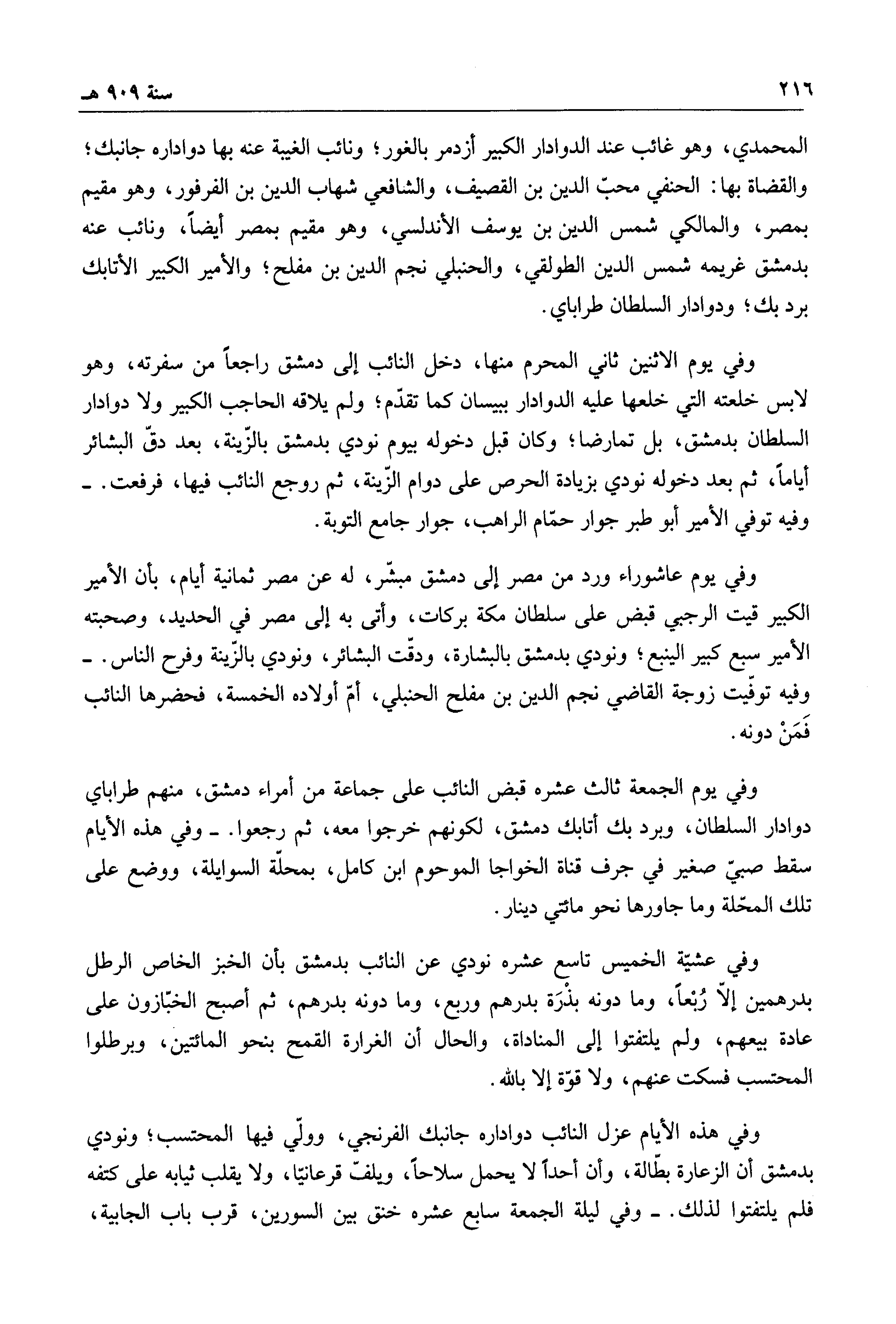 وفي يوم الجمعة ثالث عشره قبض النائب على جماعة من أمراء دمشق، منهم طراباي دوادار السلطان، وبرد بك أتابك دمشق، لكونهم خرجوا معه، ثم رجعوا.