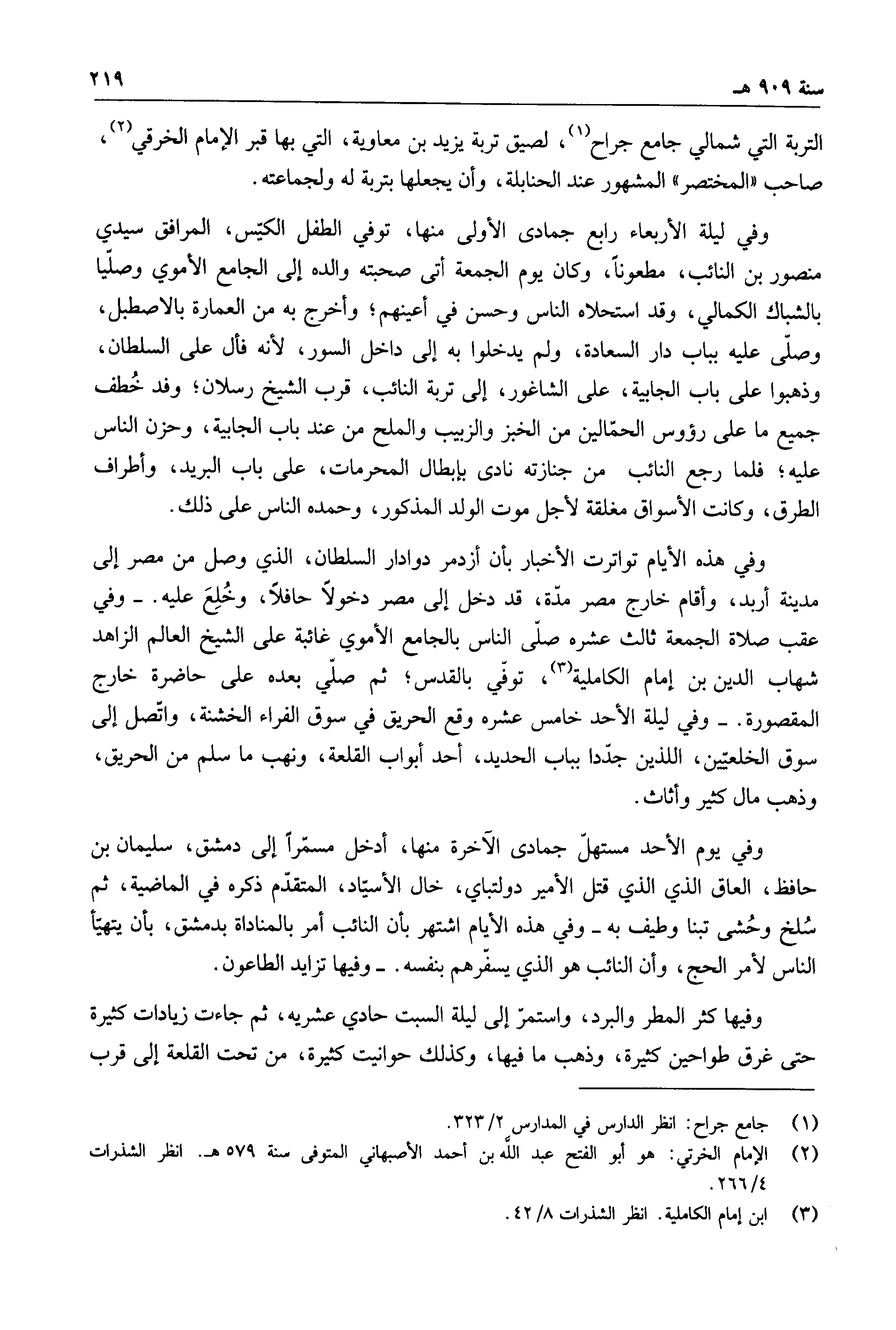 وفي عقب صلاة الجمعة ثالث عشره صلى الناس بالجامع الأموي غائبة على الشيخ العالم الزاهد شهاب لدين بن إمام الكاملية، توفي بالقدس؛ ثم صلي بعده على حاضرة خارج المقصورة.