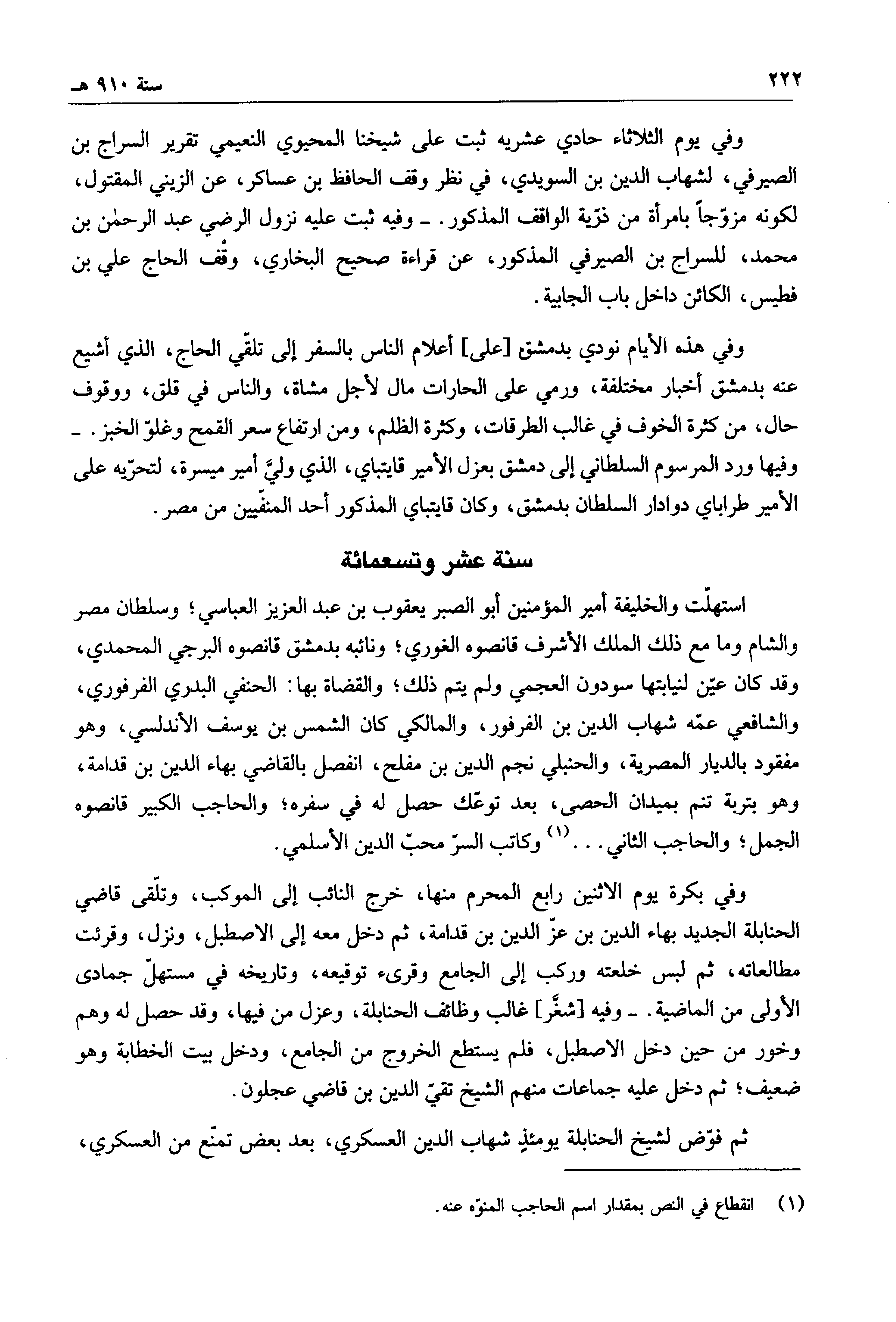 استهلت والخليفة أمير المؤمنين أبو الصبر يعقوب بن عبد العزيز العباسي؛ وسلطان مصر والشام وما مع ذلك الملك الأشرف قانصوه الغوري؛ ونائبه بدمشق قانصوه البرجي المحمدي، وقد كان عين لنيابتها سودون العجمي ولم يتم ذلك؛ والقضاة بها: الحنفي البدري الفرفوري، والشافعي عمه شهاب الدين بن الفرفور، والمالكي كان الشمس بن يوسف الأندلسي، وهو مفقود بالديار المصرية، والحنبلي نجم الدين بن مفلح، انفصل بالقاضي بهاء الدين بن قدامة، وهو بتربة تنم بميدان الحصى، بعد توعك حصل له في سفره؛ والحاجب الكبير قانصوه الجمل؛ والحاجب الثاني ... وكاتب السر محب الدين الأسلمي.