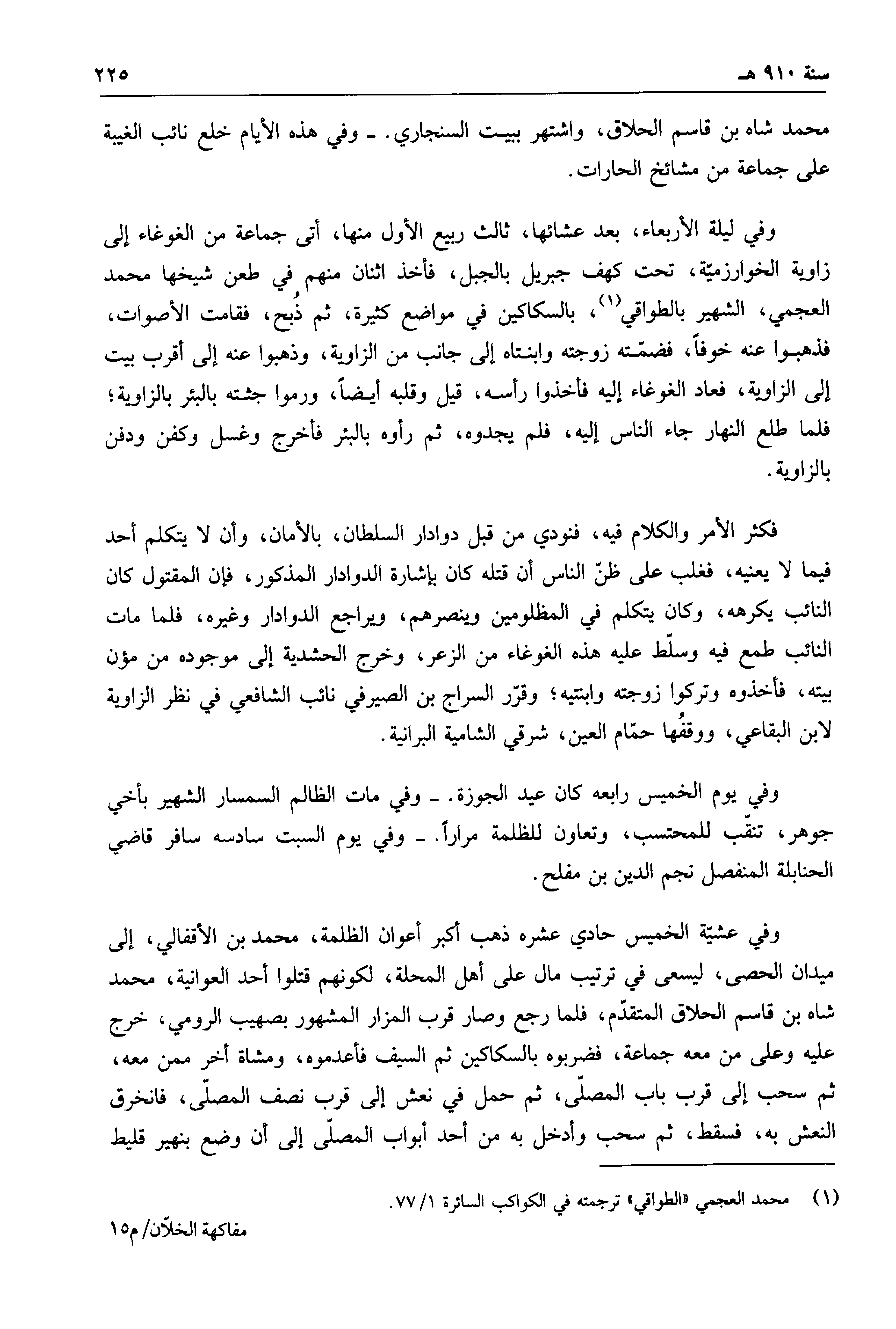 وفي ليلة الأربعاء، بعد عشائها، ثالث ربيع الأول منها، أتى جماعة من الغوغاء إلى زاوية الخوارزمية، تحت كهف جبريل بالجبل، فأخذ اثنان منهم في طعن شيخنا محمد العجمي، الشهير بالطواقي، بالسكاكين في مواضع كثيرة، ثم ذبح، فقامت الأصوات، فذهبوا عنه خوفاً، فضمته زوجته وابنتاه إلى جانب من الزاوية، وذهبوا عنه إلى أقرب بيت إلى الزاوية، فعاد الغوغاء إليه فأخذوا رأسه، قيل وقلبه أيضاً، ورموا جثته بالبئر بالزاوية؛ فلما طلع النهار جاء الناس إليه، فلم يجدوه، ثم رأوه بالبئر فأخرج وغسل وكفن ودفن بالزاوية.