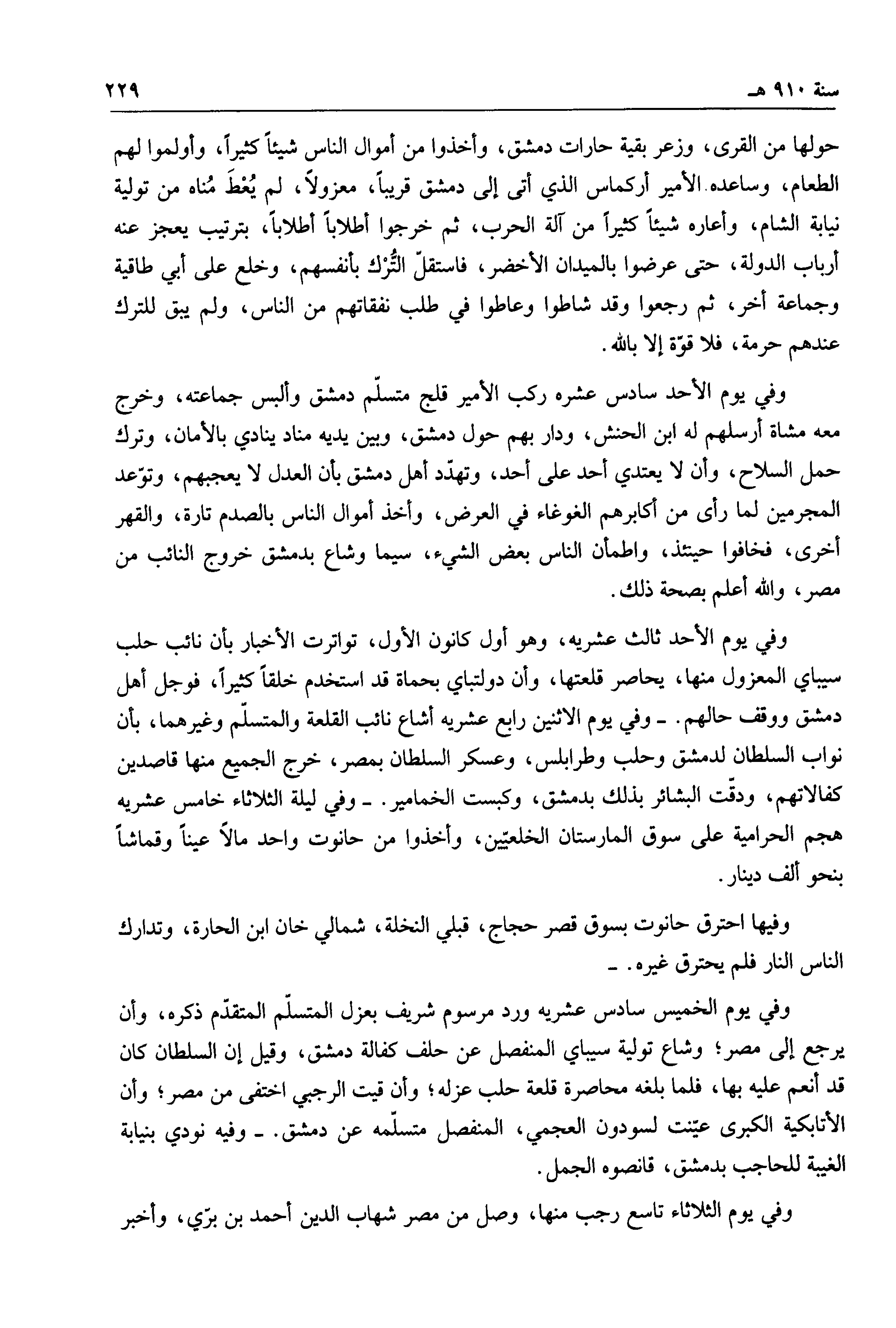حولها من القرى، وزعر بقية حارات دمشق، وأخذوا من أموال الناس شيئاً كثيراً، وأولموا لهم الطعام، وساعده الأمير أركماس الذي أتى إلى دمشق قريباً، معزولاً، لم يعط مناه من تولية نيابة الشام، وأعاره شيئاً كثيراً من آلة الحرب، ثم خرجوا أطلاباً أطلاباً، بترتيب يعجز عنه أرباب الدولة، حتى عرضوا بالميدان الأخضر، فاستقل الترك بأنفسهم، وخلع على أبي طاقية وجماع أخر، ثم رجعوا وقد شاطوا وعاطوا في طلب نفقاتهم من الناس، ولم يبق للترك عندهم حرمة، فلا قوة إلا بالله.