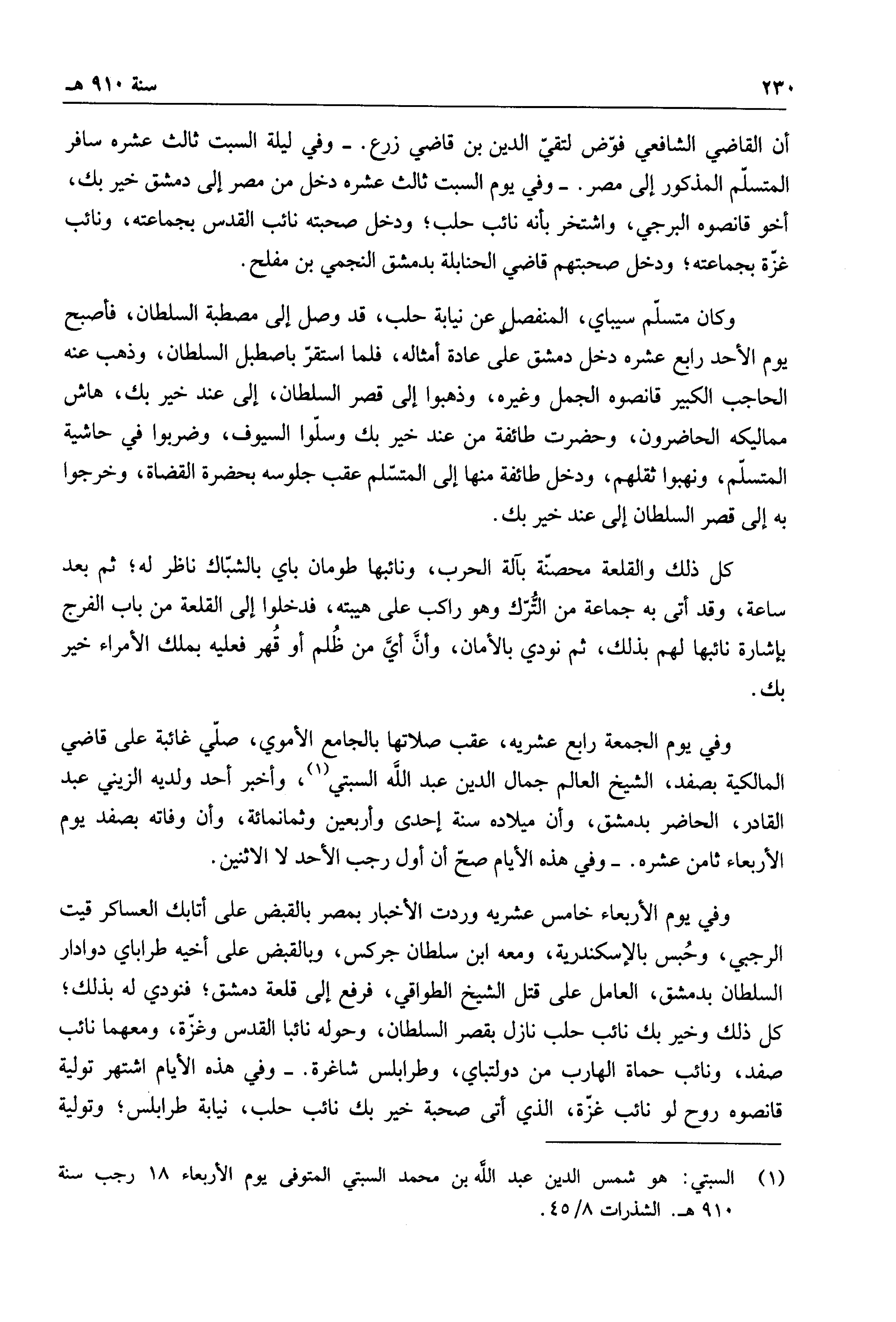 وكان متسلم سيباي، المنفصل عن نيابة حلب، قد وصل إلى مصطبة السلطان، فأصبح يوم الأحد رابع عشره دخل دمشق عل عادة أمثاله، فلما استقر باصطبل السلطان، وذهب عنه الحاجب الكبير قانصوه الجمل وغيره، وذهبوا إلى قصر السلطان، إلى عند خير بك، هاش مماليكه الحاضرون، وحضرت طائفة من عند خير بك وسلوا السيوف، وضربوا في حاشية المتسلم، ونهبوا ثقلهم، ودخل طائفة منها إلى المتسلم عقب جلوسه بحضرة القضاة، وخرجوا به إلى قصر السلطان إلى عند خير بك.