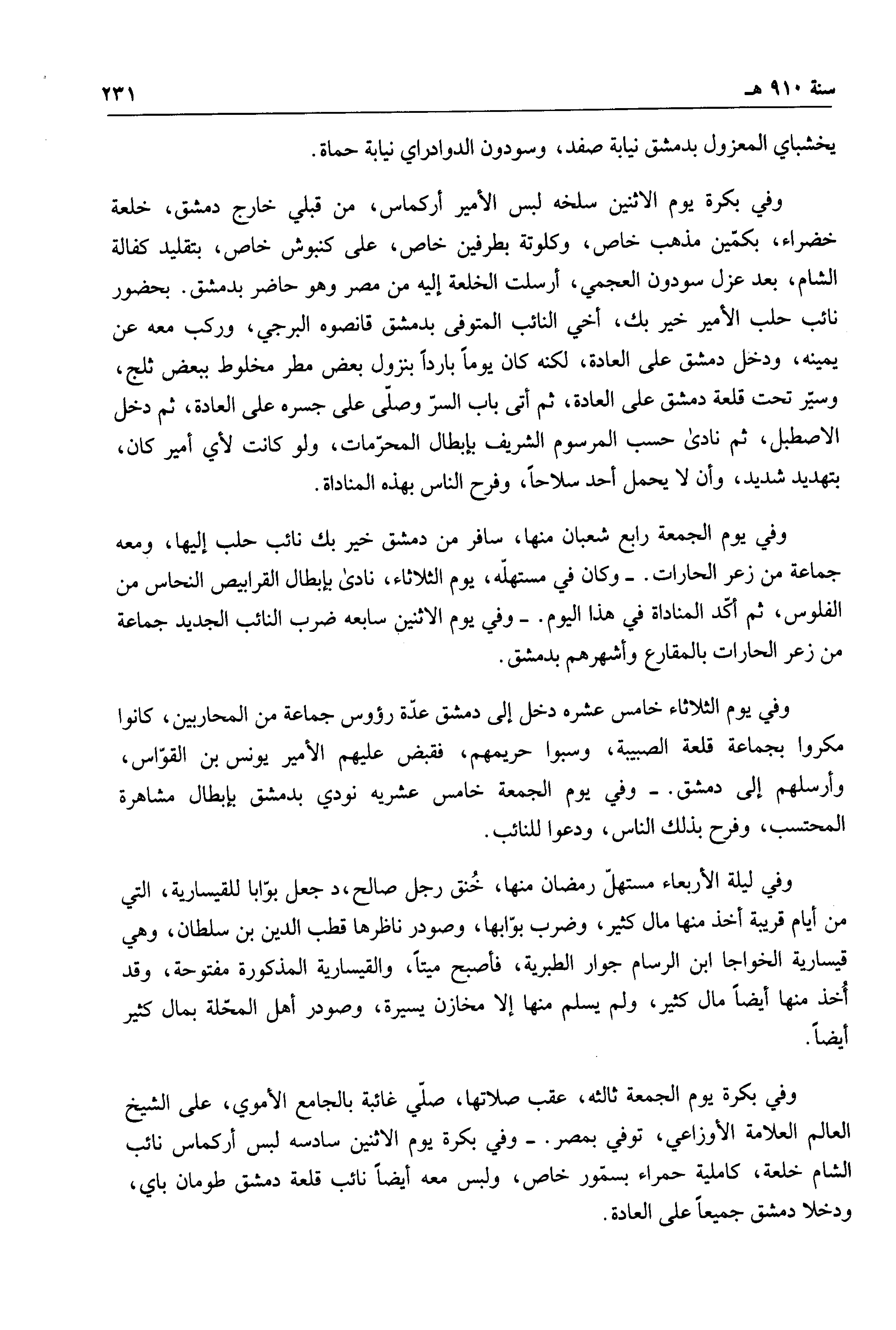 وفي بكرة يوم الاثنين سادسه لبس أركماس نائب الشام خلعة، كاملية حمراء بسمور خاص، ولبس معه أيضاً نائب قلعة دمشق كومان باي، ودخلا دمشق جميعاً على العادة.
