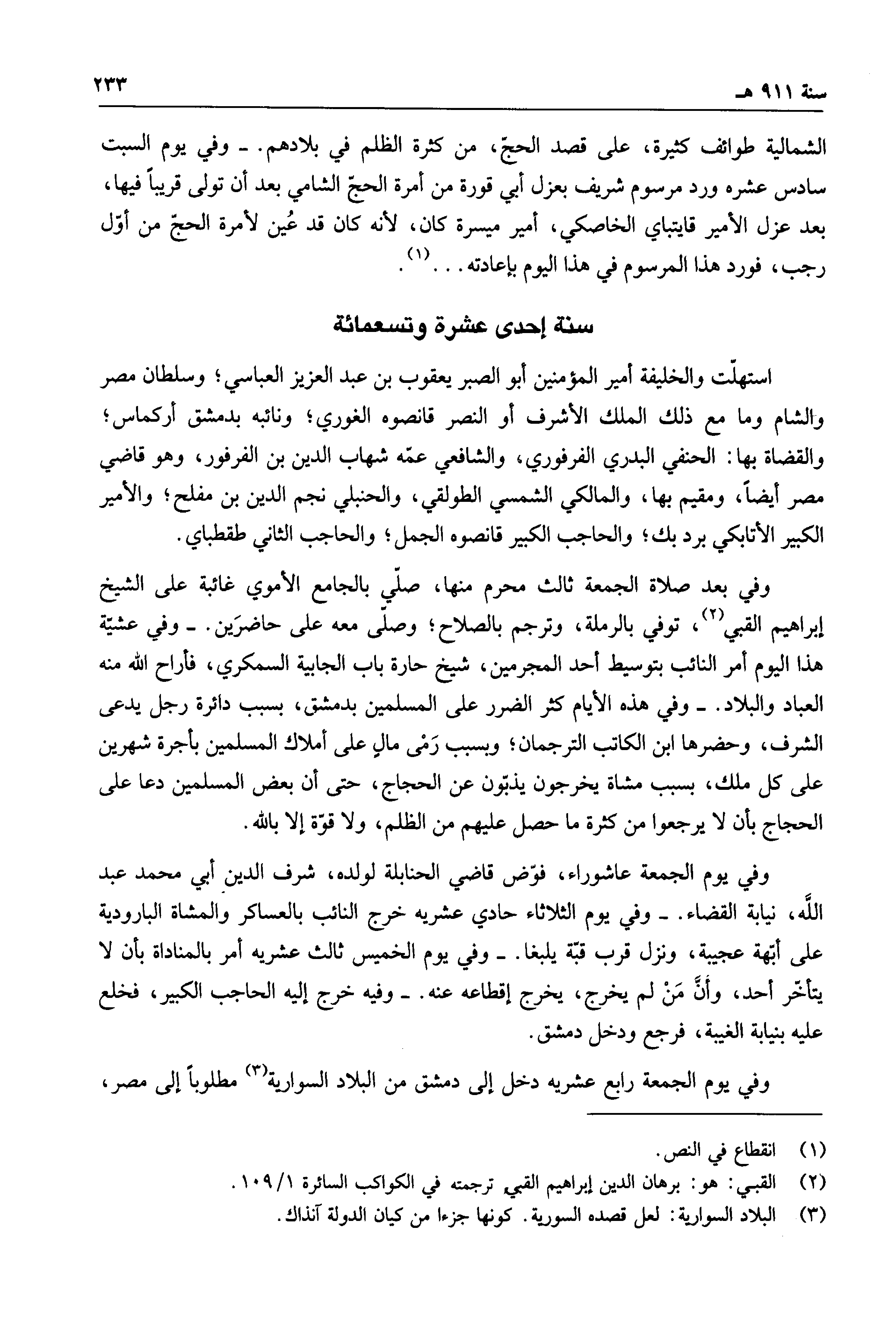 وفي بعد صلاة الجمعة ثالث من محرم منها، صلي بالحامع الأموي ائبة على الشيخ إبراهيم القبي، توفي بالرملة، وترجم بالصلاح؛ وصلى معه على حاضرين. وفي عشية هذا اليوم أمر النائب بتوسط أحد المجرمين، شيخ حارة باب الجابية السمكري، فأراح الله منه العباد والبلاد. وفي هذه الأيام كثر الضرر على المسلمين بدمشق، بسب دائرة رجل يدعى الشرف، وحضرها ابن الكاتب الترجمان؛ وبسبب رمى مالٍ أملاك المسلمين بأجرة شهرين على كل ملك، بسب مشاة يخرجون يذبون عن الحجاج، حتى أن بعض المسلمين دعا على الحجاج بأن لا يرجعوا من كثرة ما حصل عليهم من الظلم، ولا قوة إلا بالله.