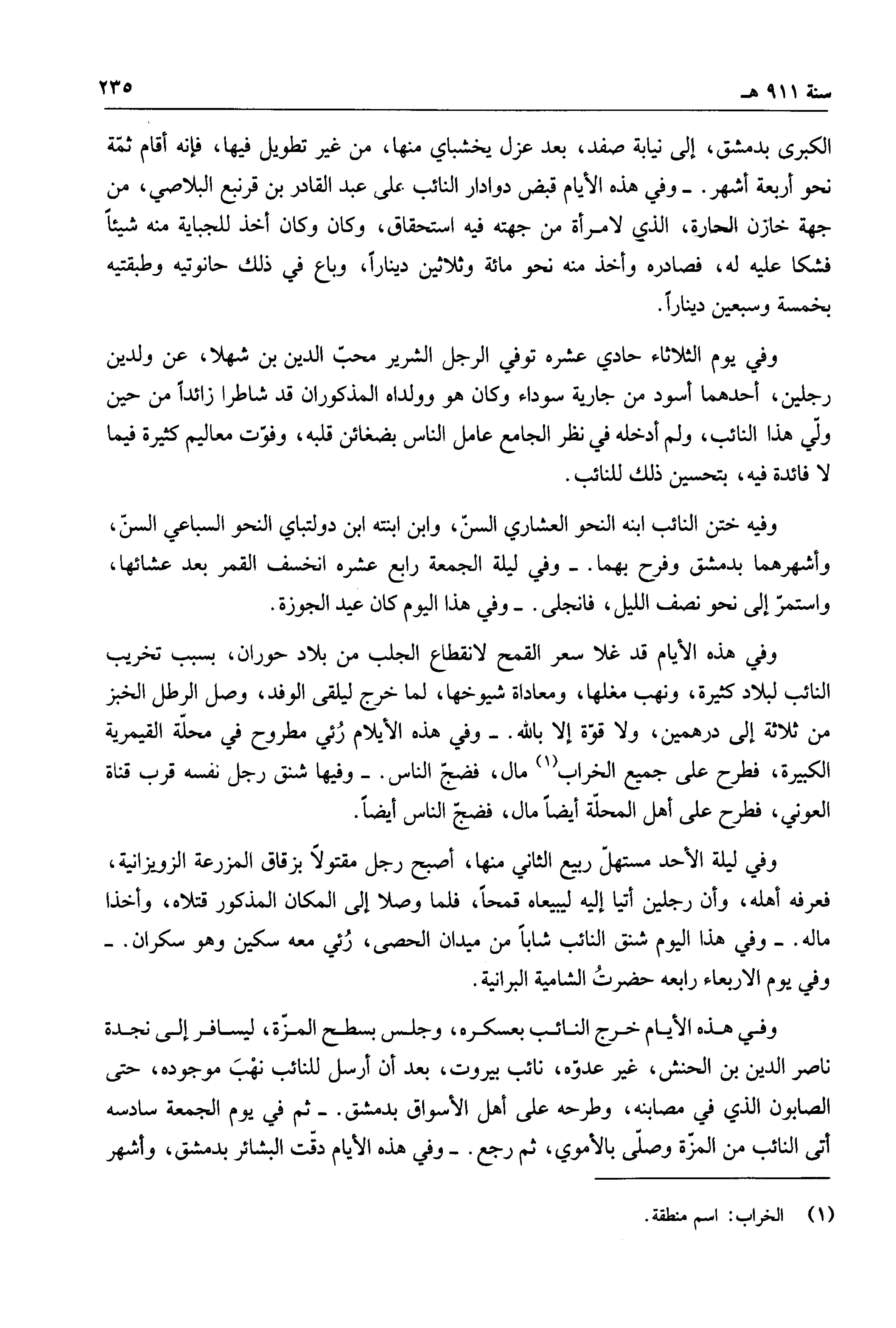 الكبرى بدمشق، إلى نيابة صفد بعد عزل يخشباي منها، من غير تطويل فيها، فإنه أقام ثمة نحو أربعة أشهر. وفي هذه الأيام قبض دوادار النائب على عبد القادر بن قرنبع البلاصي، ومن جهة خازن الحارة، الذي لا مرأة من جهته فيه استحقاق، وكان وكان أخذ للجباية منه شيئاً فشكا عليه له، فصادره وأخذ منه نحو مائة وثلاثين ديناراً، وباع في ذلك حانوتيه وطبقيته بخمسة وسبعين ديناراً.