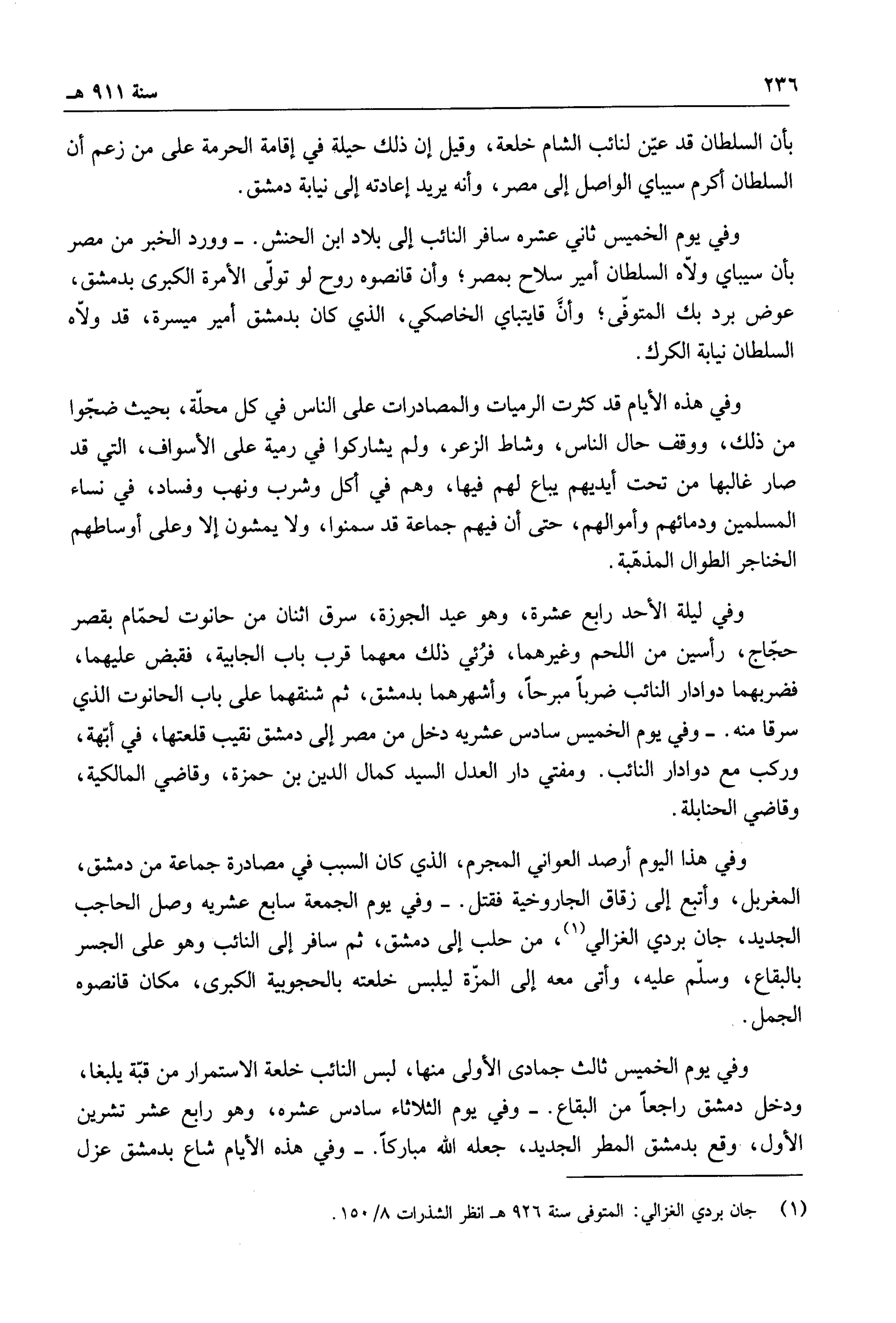 وفي هذا اليوم أرصد العواني المجرم، الذي كان السبب في مصادرة جماعة من دمشق، المغربل، وأتبع إلى زقاق الجاورخية فقتل. وفي يوم الجمعة سابع عشريه وصل الحاجب الجديد، جان بردي الغزالي، من حلب إلى دمشق، ثم سافر إلى النائب وهو على الجسر بالبقاع، وسلم عليه، وأتى معه إلى المزة ليلبس خلعته بالحجوبية الكبرى، مكان قانصوه الجمل.