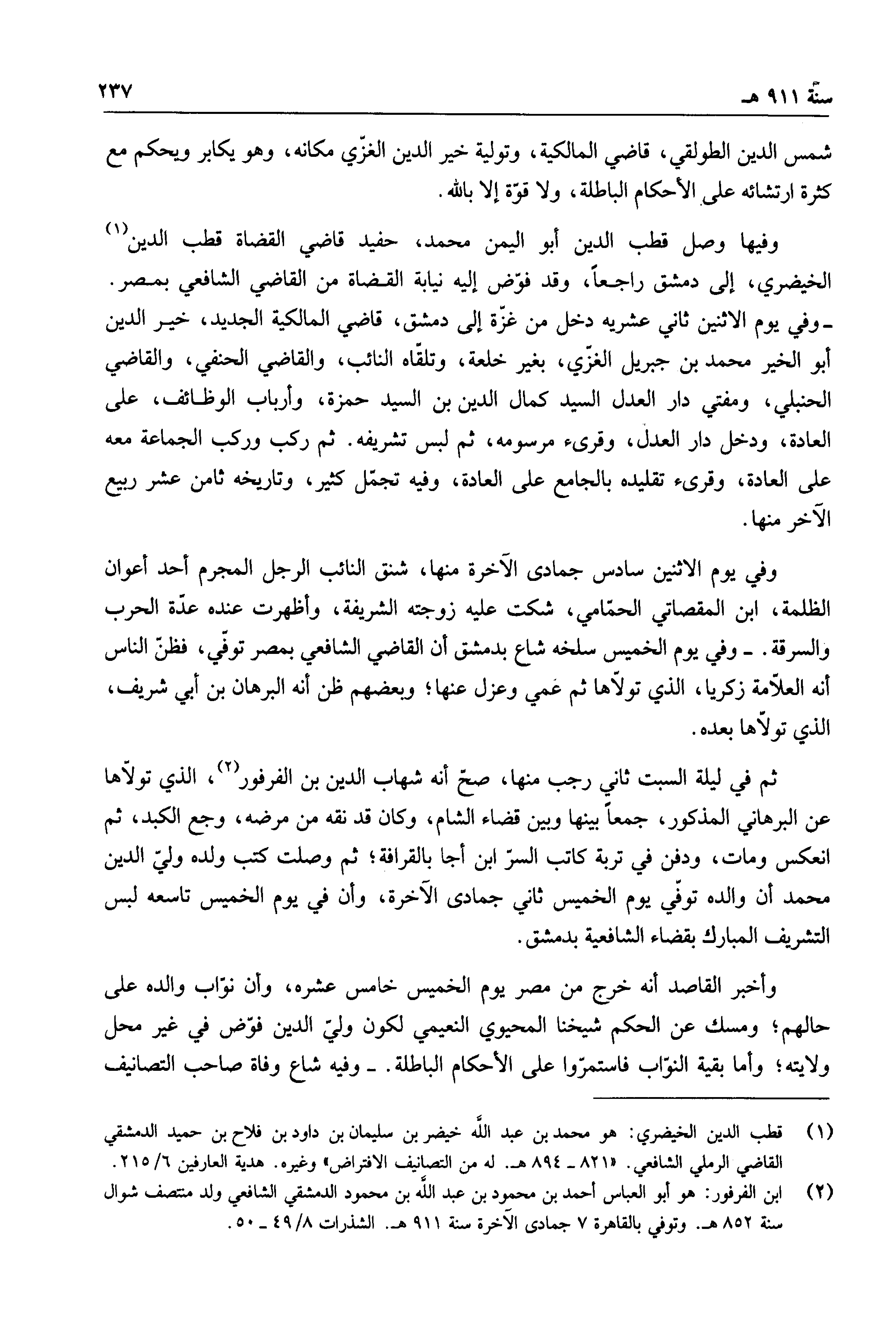 ثم في ليلة السبت ثاني رجب منها، صح أنه شهاب الدبن بن الفرفور، الذي تولاها عن البرهاني المذكور، جميعاً بينها وبين قضاء الشام، وكان قد نقد من مرضه، وجع الكبد، ثم انعكس ومات، ودفن في تربة كاتب السر ابن أجا بالقرافة، ثم وصلت كتب لده ولي الدين محمد أن والده توفي يوم الخميس ثاني جمادى الآخرة، وأن في يوم الخميس تاسعه لبس التشريف المبارك بقضاء الشافعية بدمشق.
