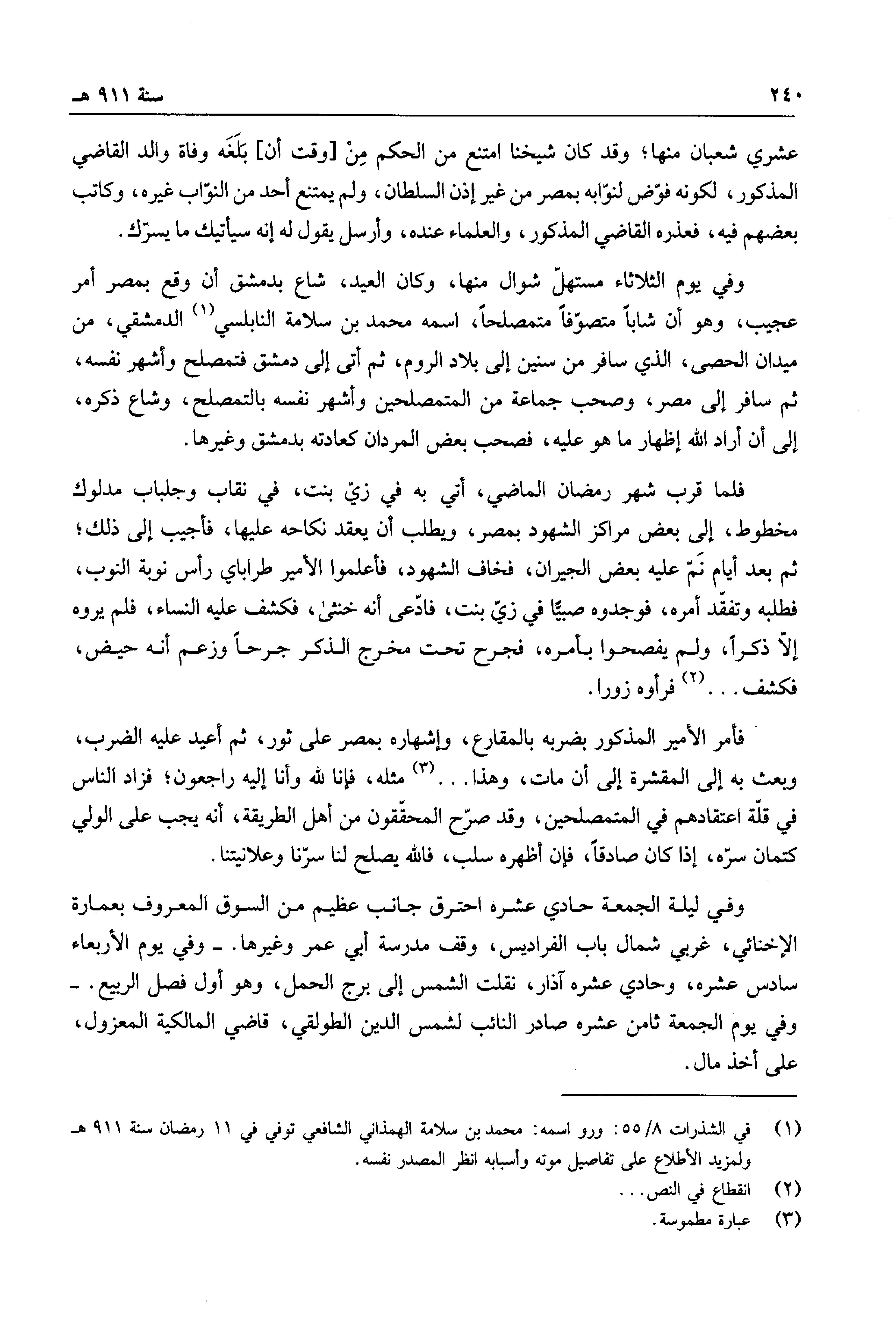 وفي يوم الثلاثاء مستهل شوال منها، وكان العيد، شاع بدمشق أن وقع بمصر أمر عجيب، وهو أن شاباً متصوفاً متمصلحاً، اسمه محمد بن سلامة النابلسي الدمشقي، من ميدان الحصى، الذي سافر من سنين إلى بلاد الروم، ثم أتى إلى دمشق فتمصلح وأشهر نفسه، ثم سافر إلى مصر، وصحب جماعة من المتمصلحين وأشهر نفسه بالتمصلح، وشاع ذكره، إلى أن أراد الله إظهار ما هو عليه، فصحب بعض المردان كعادته بدمشق وغيرها.