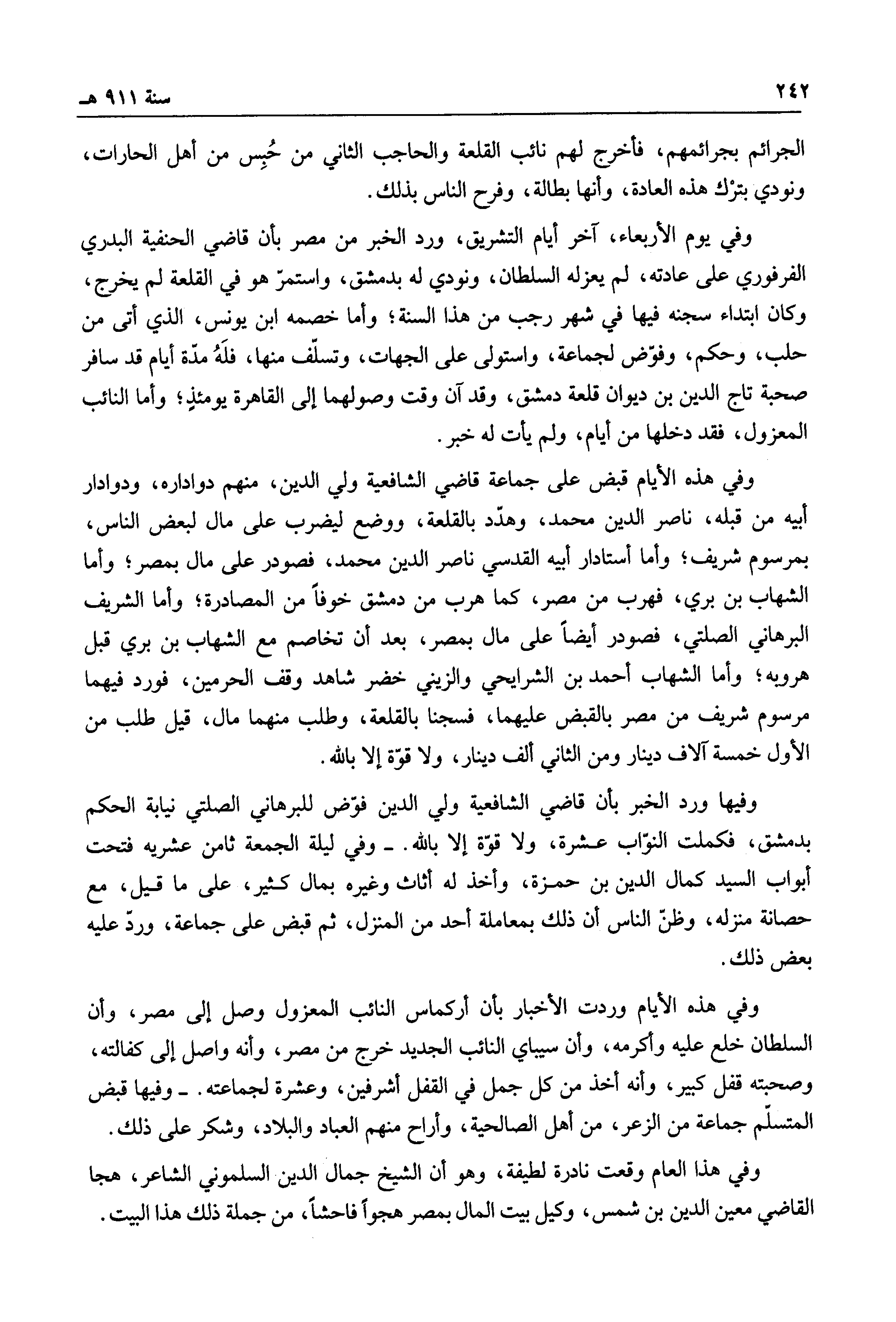 وفي هذه الأيام قبض على جماعة قاضي الشافعية ولي الدين، منهم دواداره، ودوادار أبيه من قبله، ناصر الدين محمد، وهدد بالقلعة، ووضع ليضرب على مال لبعض الناس، بمرسوم شريف؛ وأما أستادار أبيه القدسي ناصر الدين محمد، فصودر على مال بمصر؛ وأما الشهاب بن بري، فهرب من مصر، كما هرب من دمشق خوفاً من المصادرة؛ وأما الشريف البرهاني الصلتي، فصودر أيضاً على مال بمصر، بعد أن تخاصم مع الشهاب بن بري قبل هروبه؛ وأما الشهاب أحمد بن الشرايحي والزيني خضر شاهد وقف الحرمين، فورد فيهما مرسوم شريف من مصر بالقبض عليهما، فسجنا بالقلعة، وطلب منهما مال، قيل طلب من الأول خمسة آلاف دينار ومن الثاني ألف دينار، ولا قوة إلا بالله.