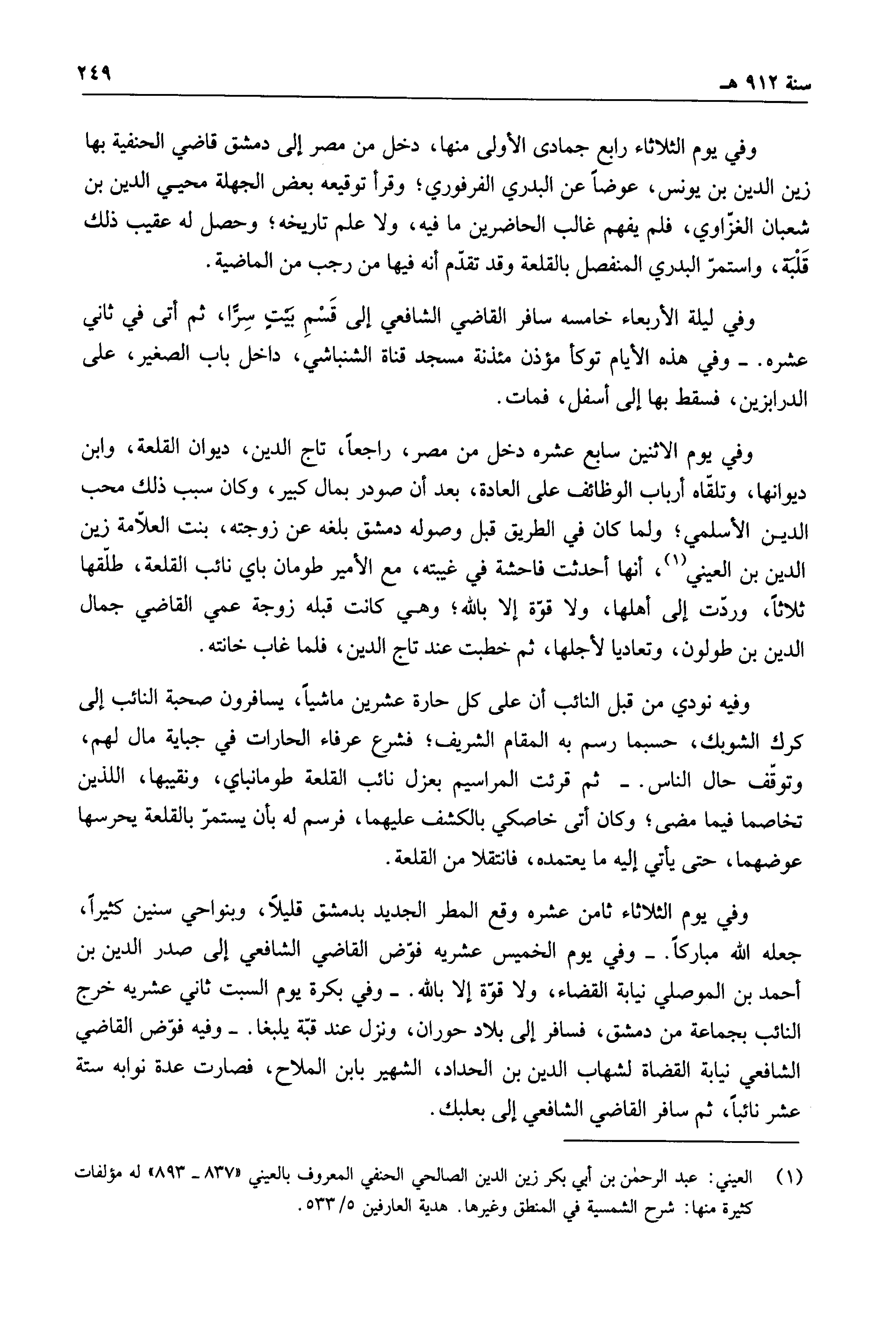 وفي يوم الثلاثاء رابع جمادى الأولى منها، دخل من مصر إلى دمشق قاضي الحنفية بها زين الدين بن يونس، عوضاً عن البدري الفرفوري؛ وقرأ توقيعه بعض الجهلة محيي الدبن بن شعبان الغزاوي، فلم يفهم غالب الحاضرين ما فيه، ولا علم تاريخه؛ وحصل له عقيب ذلك قلبه، واستمر البدري المنفصل وقد تقدم أنه فيها من رجب من الماضية.