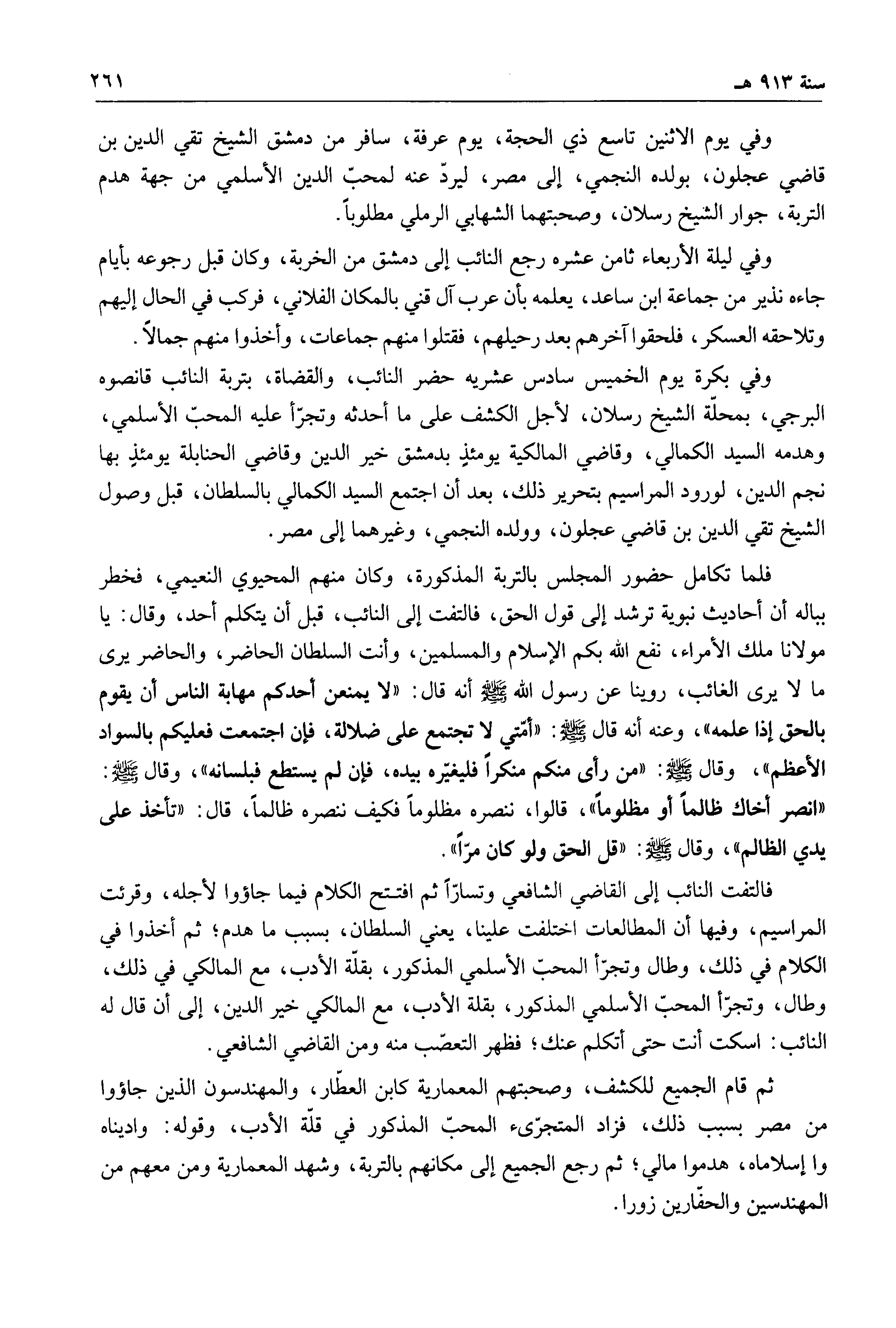 فلما تكامل حضور المجلس بالتربة المذكورة، وكان منهم المحيوي النعيمي، فخطر بباله أن أحاديث نبوية ترشد إلى قول الحق، فالتفت إلى النائب، قبل أن يتكلم أحد، وقال: يا مولانا ملك الأمراء، نفع الله بكم الإسلام والمسلمين، وأنت السلطان الحاضر، والحاضر يرى ما لا يرى الغائب، روينا عن رسول الله صلى الله عليه وسلم أنه قال: " لا يمنعن أحدكم مهابة الناس أن يقوم بالحق إذا علمه "، وعنه أنه قال صلى الله عليه وسلم: " أمتي لا تجتمع على ضلالة، فإن اجتمعت فعليكم بالسواد الأعظم "، وقال صلى الله عليه وسلم: " من رأى منكم منكراً فليغيره بيده، فإن لم يستطع فبلسانه "، وقال صلى الله عليه وسلم: " انصر أخاك ظالماً أو مظلوماً " قالوا، ننصره مظلوماً فكيف ننصره ظالماً، قال: " تأخذ على يدي الظالم "، وقال صلى الله عليه وسلم: " قل الحق ولو كان مراً ".