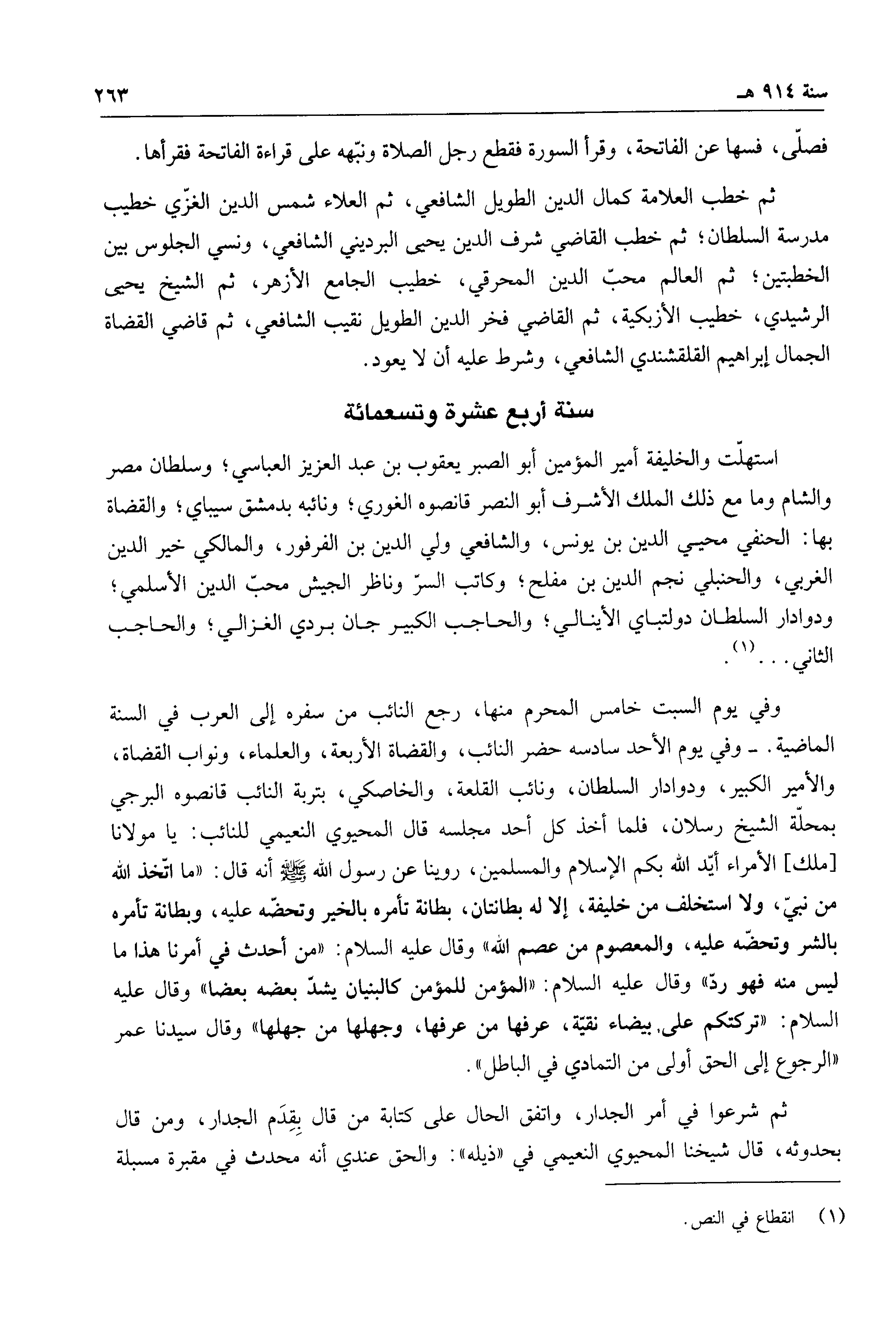 وفي يوم السبت خامس المحرم منها، رجع النائب من سفره إلى العرب في السنة الماضية. - وفي يوم الأحد سادسه حضر النائب، والقضاة الأربعة، والعلماء، ونواب القضاة، والأمير الكبير، ودوادار السلطان، ونائب القلعة، والخاصكي، بتربة النائب قانصوه البرجي بمجلّة الشيخ رسلان، فلما أخذ كل أحد مجلسه قال المحيوي النعيمي للنائب: يا مولانا ملك الأمراء أيّد الله بكم الإسلام والمسلمين، روينا عن رسول الله صلى الله عليه وسلم أنه قال: " ما اتخذ الله من نبيّ، ولا استخلف من خليفة، إلا له بطانتان، بطانة تأمره بالخير وتحضه عليه، وبطانة تأمره بالشر وتحضه عليه، والمعصوم من عصم الله " وقال عليه السلام: " من أحدث في أمرنا هذا ما لبس منه فهو ردّ " وقال عليه السلام: " المؤمن للمؤمن كالبنيان يشدّ بعضه بعضا " وقال عليه السلام: " تركتكم على بيضاء نقيّة، عرفها من عرفها، وجهلها من جهلها " وقال سيدنا عمر " الرجوع إلى الحق أولى من التمادي في الباطل ".