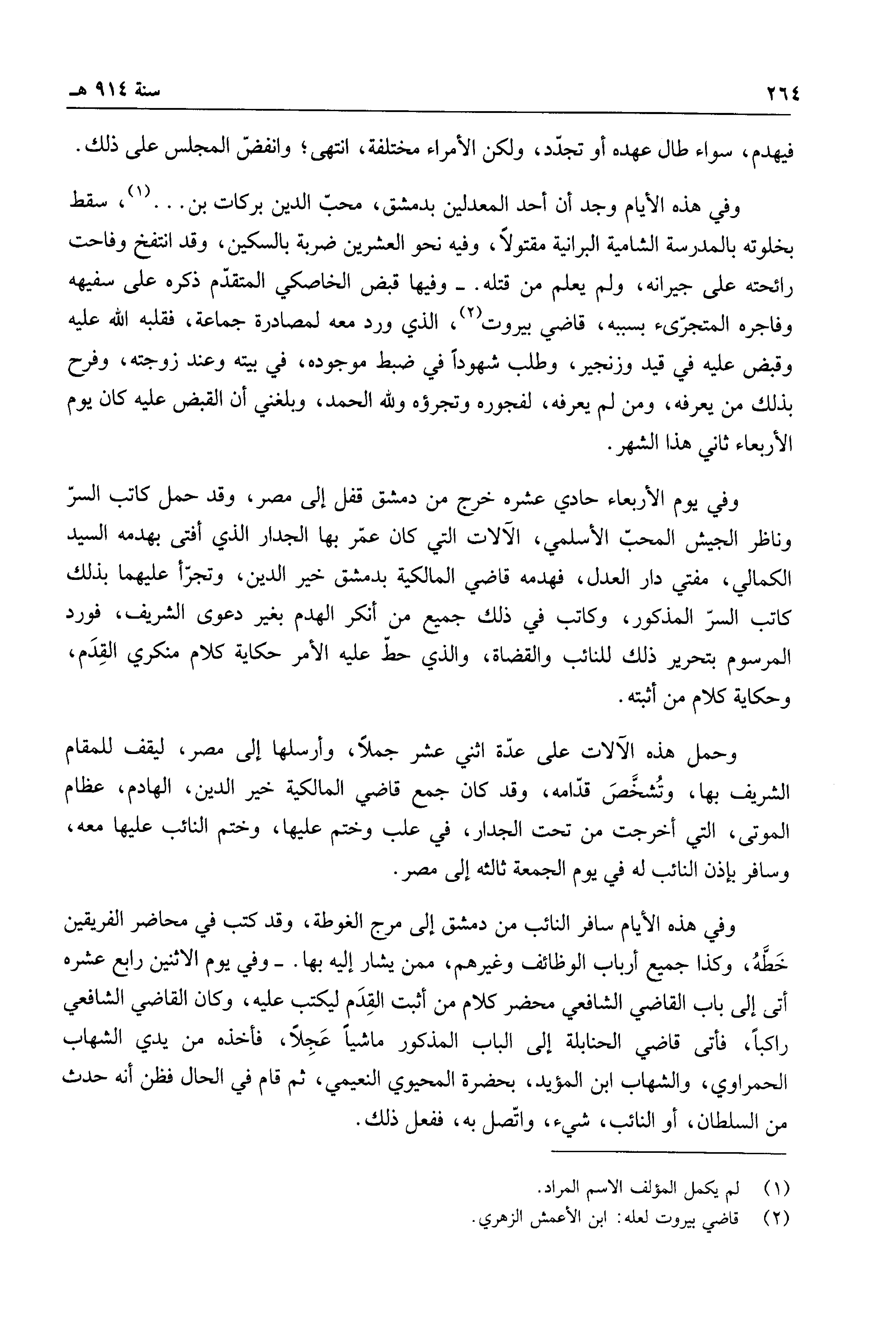 وفي هذه الأيام وجد أن أحد المعدلين بدمشق، محبّ الدين بركات بن ... ، سقط بخلوته بالمدرسة الشامية البرانية مقتولاً، وفيه نحو العشرين ضربة بالسكين، وقد انتفخ وفاحت رائحته على جيرانه، ولم يعلم من قتله. - وفيها قبض الخاصكي المتقدم ذكره على سفيهه وفاجره المتجرّيء بسببه، قاضي بيروت، الذي ورد معه لمصادرة جماعة، فقلبه الله عليه وقبض عليه في قيد وزنجير، وطلب شهوداً في ضبط موجوده، في بيته وعند زوجته، وفرح بذلك من يعرفه، ومن لم يعرفه، لفجوره وتجرؤه ولله الحمد، وبلغني أن القبض عليه كان يوم الأربعاء ثاني هذا الشهر.
