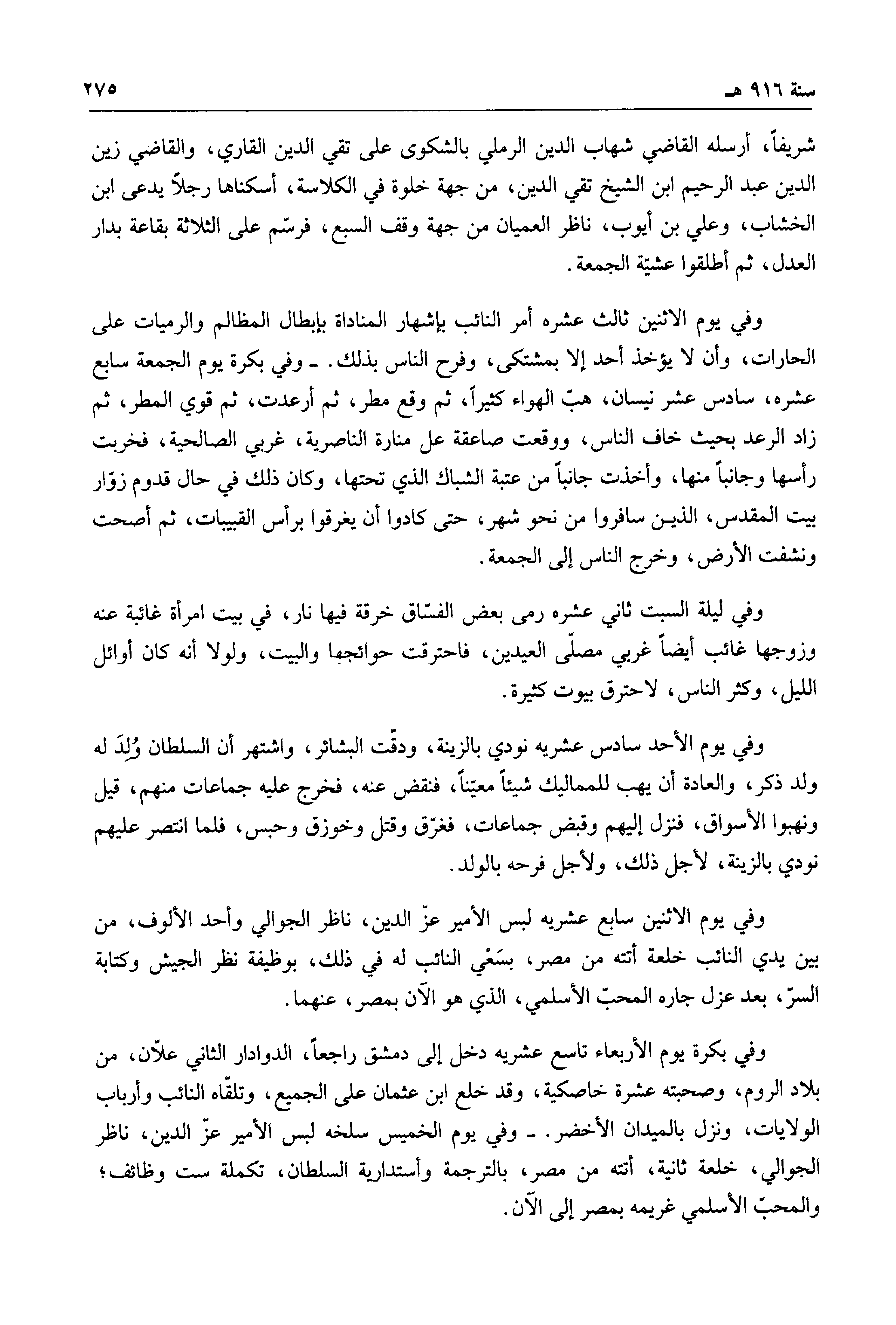 وفي يوم الأحد سادس عشريه نودي بالزينة، ودقت البشائر، واشتهر أن السلطان ولد له ولد ذكر، والعادة أن يهب للمماليك شيئاً معيناً، فنقض عنه، فخرج عليه جماعات منهم، قيل ونهبوا الأسواق، فنزل إليهم وقبض جماعات، فغرق وقتل وخوزق وحبس، فلما انتصر عليهم نودي بالزينة، لأجل ذلك، ولأجل فرحة بالولد.