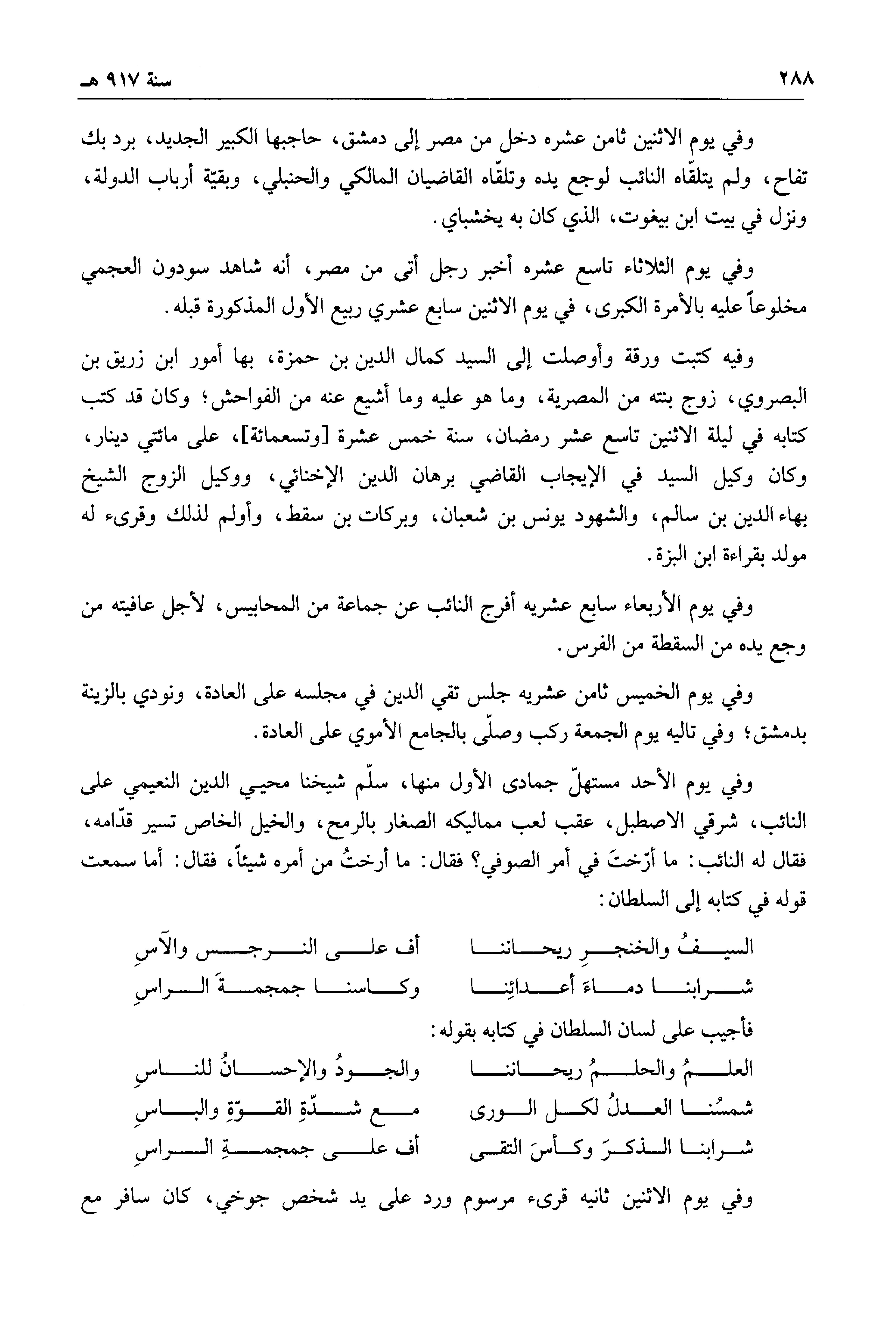 وفي يوم الأحد مستهل جمادى الأول منها، سلم شيخنا محيي الدين النعيمي على النائب، شرقي الاصطبل، عقب لعب مماليكه الصغار بالرمح، والخيل الخاص تسير قدامه، فقال له النائب: ما أرخت في أمر الصوفي؟ فقال: ما أرخت من أمره شيئاً، فقال: أما سمعت قوله في كتابه إلى السلطان: